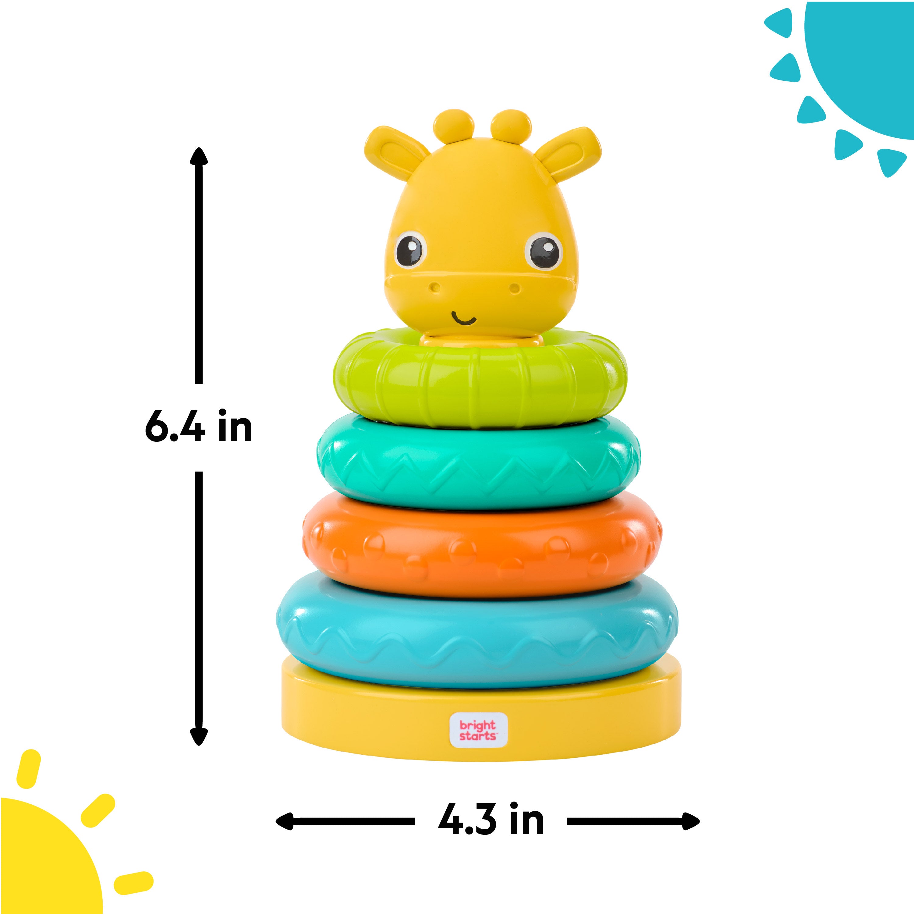 - Help your little one build fine motor skills with the Bright Starts Giraffe Tower; stack four colorful rings toward the giraffe’s friendly face