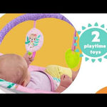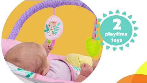 Bounce into a tropical jungle adventure with the new Wildflower Wonders Vibrating Bouncer from America’s #1 infant bouncer brand, Bright Starts! Your little one can relax and play in the cozy seat while exploring the toy bar featuring a crinkle medallion with silky tags and a textured leaf toy to engage their senses. Encourage baby’s motor skill development as they reach for and bat at the toys! With soothing vibrations activated by simple on/off controls, calming comfort is just a switch away. Safety is our top priority with a 3-point harness and non-slip feet, ensuring a secure playtime. Plus, the pink jungle and machine washable fabrics make cleanup a breeze, while the compact design and removable toy bar make it easy to store or bring along on travels. Designed for ages 0 to 6 months, this baby bouncer provides the perfect mix of playtime fun and soothing relaxation. 1 C battery required, not included. (*Circana, Retail Tracking Service, Bouncers, U.S. dollar sales, January-November 2023 combined)