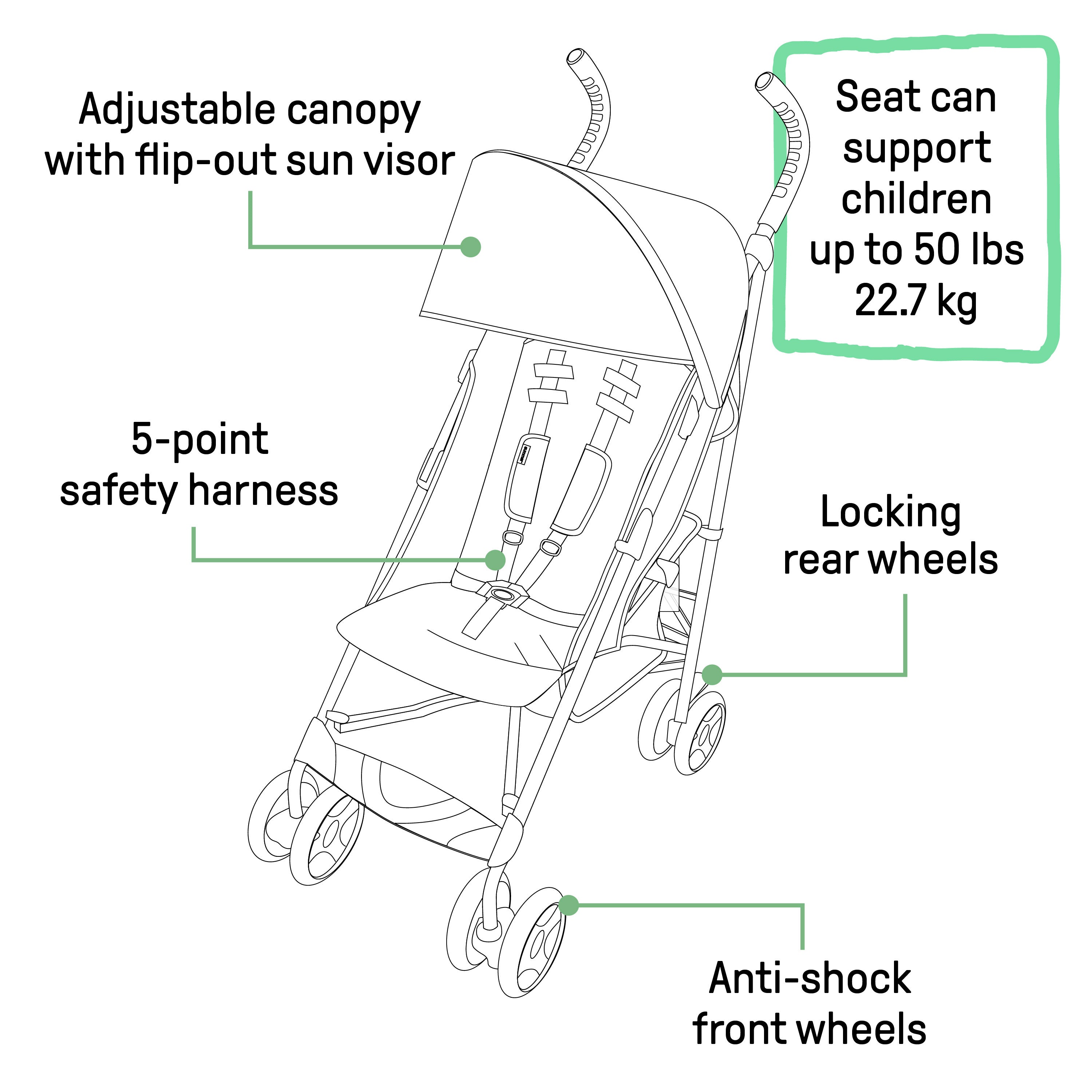 - Folds compactly and auto locks for simple storage and easy travel; adjustable and removable canopy with flip out sun visor is perfect for sunny days.