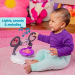 - Designed with a sturdy frame and rubber brake feet to keep baby safe while she plays; 23.5" (H) x 25.5" (W) x 28.5" (D); assembly required; powered by 3 AA batteries (not included)