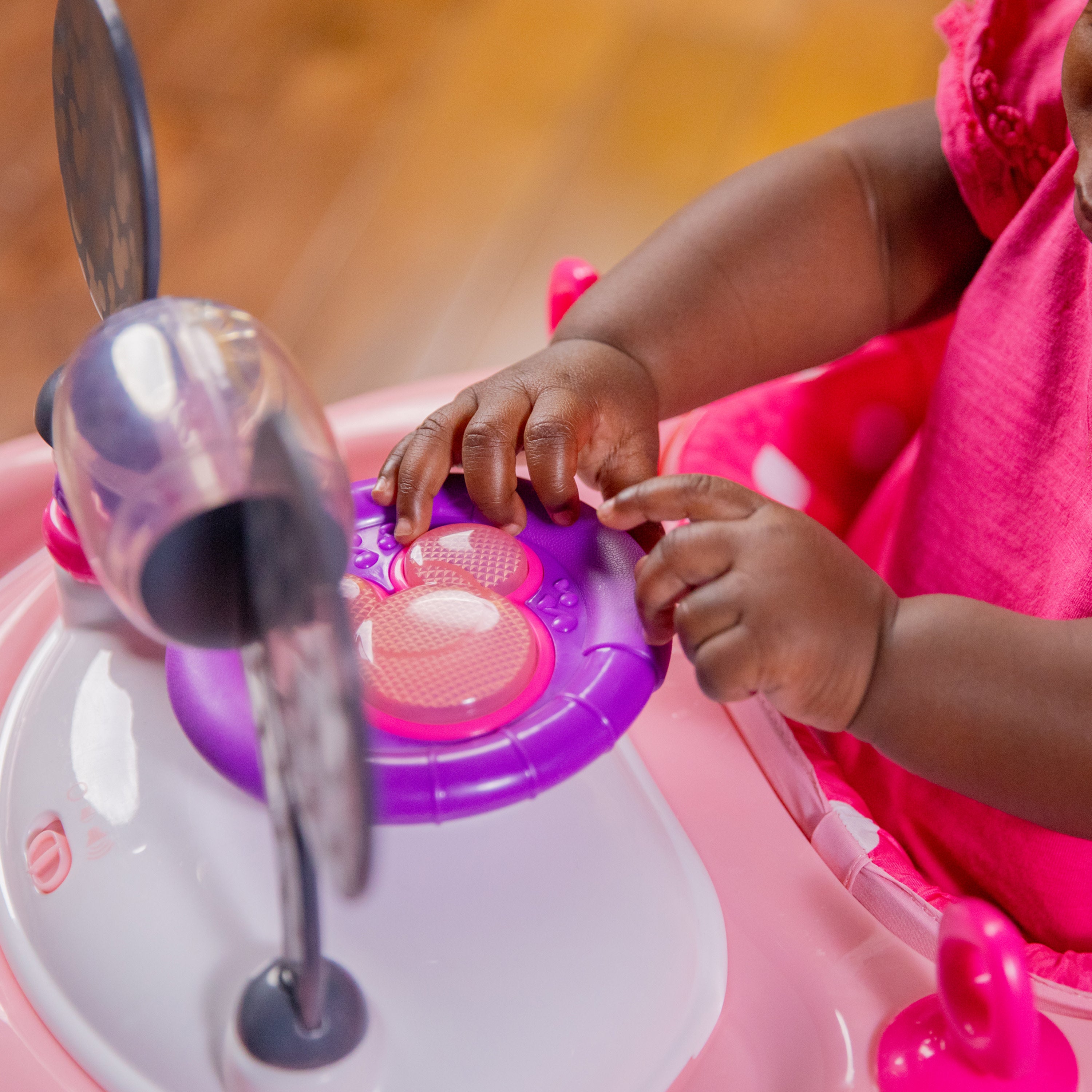 Baby will go, go crazy for the Go, Go Bows 3-in-1 Car Walker featuring Disney Minnie Mouse! Powered by Bright Starts, the car walker features 3 grow-with-me modes: sit-in car walker, push-behind walker, and portable electronic toy station! Get cruising with baby from 6 months to 2 years old or more —the walker grows with baby from early exploration to first steps to expert level “driver.” Complete with beloved Minnie Mouse details: iconic ears on the steering wheel, pink polka dots, Minnie’s signature bow and Minnie-themed toys with lights and sounds. Baby won’t be able to contain their giggles as they drive down hallway highways with mom and dad cheering them on. Remove the toy station for fun on the floor or on the go! Activate five unique sound effects and melodies with the back-lit push button horn to have a little fun in traffic. Plus, add baby’s favorite toys with the 2 provided link loops and illuminate baby’s world with fun lights when you honk the horn! You’ll love the 3 different adjustable height positions, the safety features and convenient storage. Simply lay flat when not in use! Wipe clean with damp cloth and mild soap, seat pad machine washable. Powered by 3 AA batteries (not included).