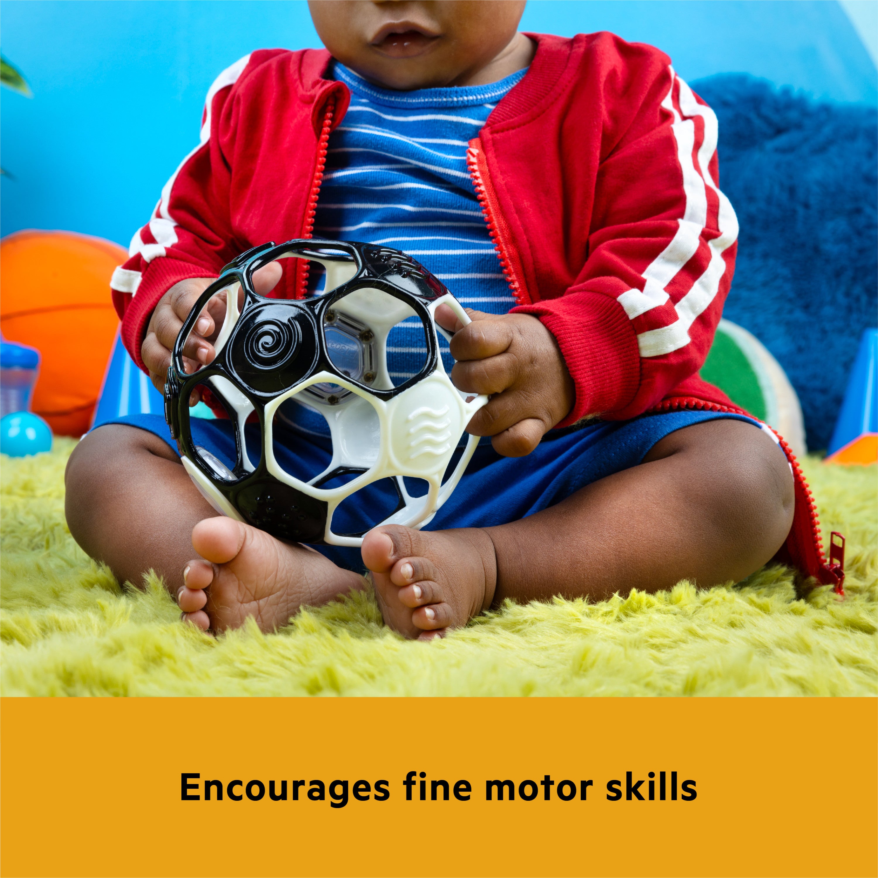Ready, grasp, scoooore! Made with Bright Starts’ flexible, durable Oball technology, the Grippin’ Goals Rattle Ball features an easy grasp design with lots of finger holes for even the most inexperienced soccer stars to get a grip. Promote baby’s fine motor skills with this rattling ball – perfect to toss, roll, shake and kick. Rattle beads inside the black and white soccer ball introduce cause and effect for baby, encouraging their cognitive development. Easily take baby’s favorite ball on the go. It fits perfectly in a diaper bag for entertainment wherever your day leads. Baby’s first soccer ball will have them squealing with delight as they explore the fun of grasping, shaking, rolling, and so much more. Ideal for ages newborn and up. Compact size for little hands and easy storage: 5.0" (H) x 5.0" (W) x 5.0" (D). Baby shower gift idea for little boys or girls and future soccer fans!