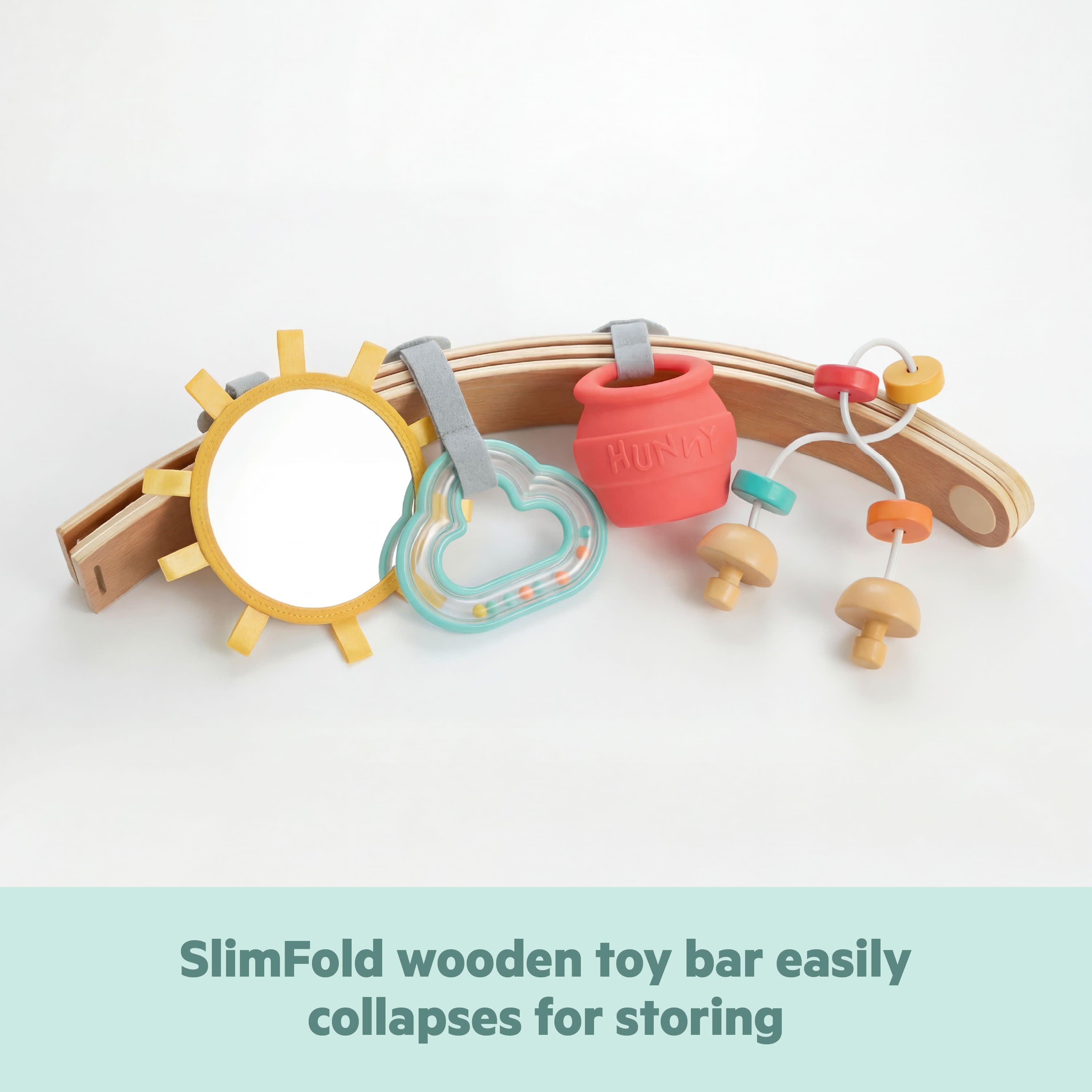 - Set up, fold up, and transport easily with the SlimFold wooden toy bars and 2 handles; toy bars and prop pillow store in folded-up mat; save space or take on the go with proprietary space-saving design