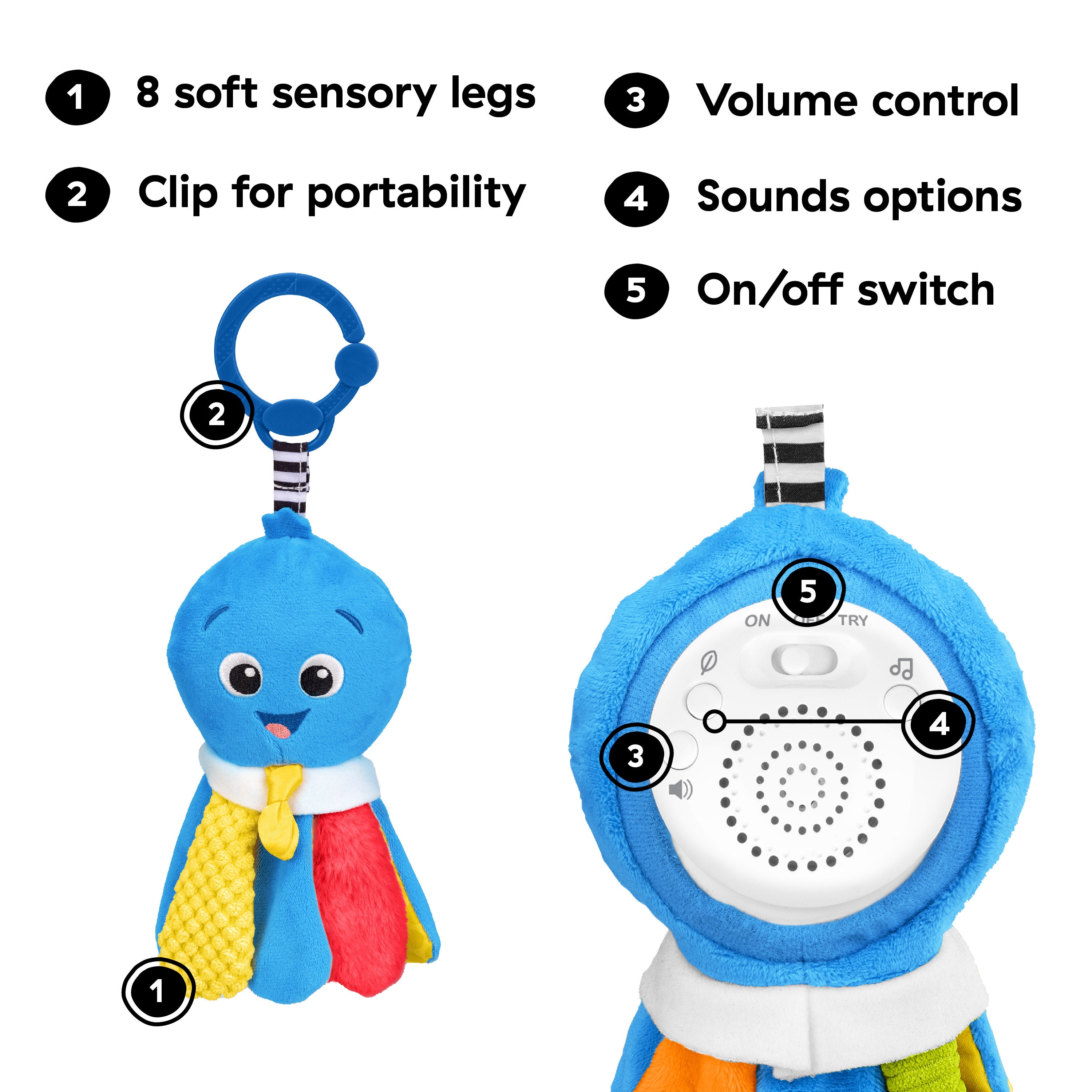 - Features Opus the Octopus character; squeeze Opus to hear music and calming sounds; explore stretchy arms for multisensory engagement