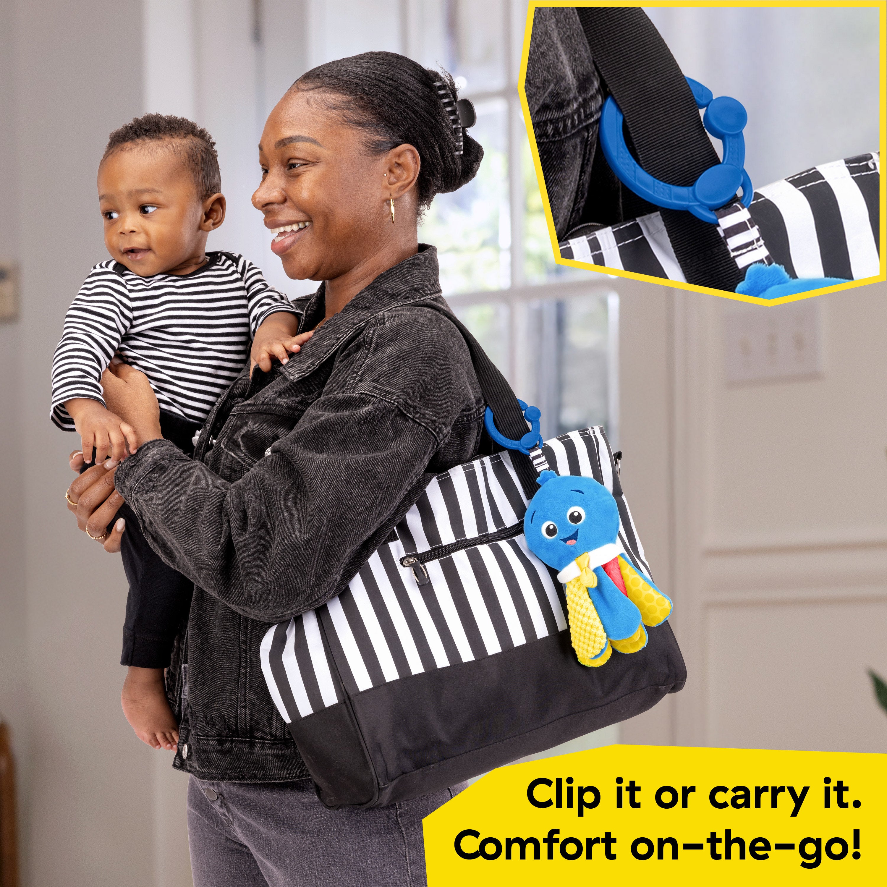Comfort and reward baby at home or on the go with the Baby Einstein Take Along Opus Soother. This soft, engaging soother from the makers of the #1 Selling Soother* takes baby from fussy to happy with just a touch. Designed in the USA to engage baby’s senses and encourage self-soothing, your baby will love to relax and play with this calming, ocean friend. Explore Opus’s super-soft stretchy arms or give him a squeeze to hear music or sounds: 10 upbeat melodies, 10 soothing melodies, and 4 calming sounds. Perfect for on-the-go, Opus attaches to strollers, carriers, and diaper bags and can lay on a flat surface to play music as baby winds down from a long day. Up to 15 minutes run time. Includes 2 demo AA batteries. Wipes clean. Dimensions: 2.76 x 3.94 x 12.01 inches. Ages 0+ Months. (Circana, Retail Tracking Service, Other Infant Toys, U.S. dollar sales, April 2023 - March 2024 combined)