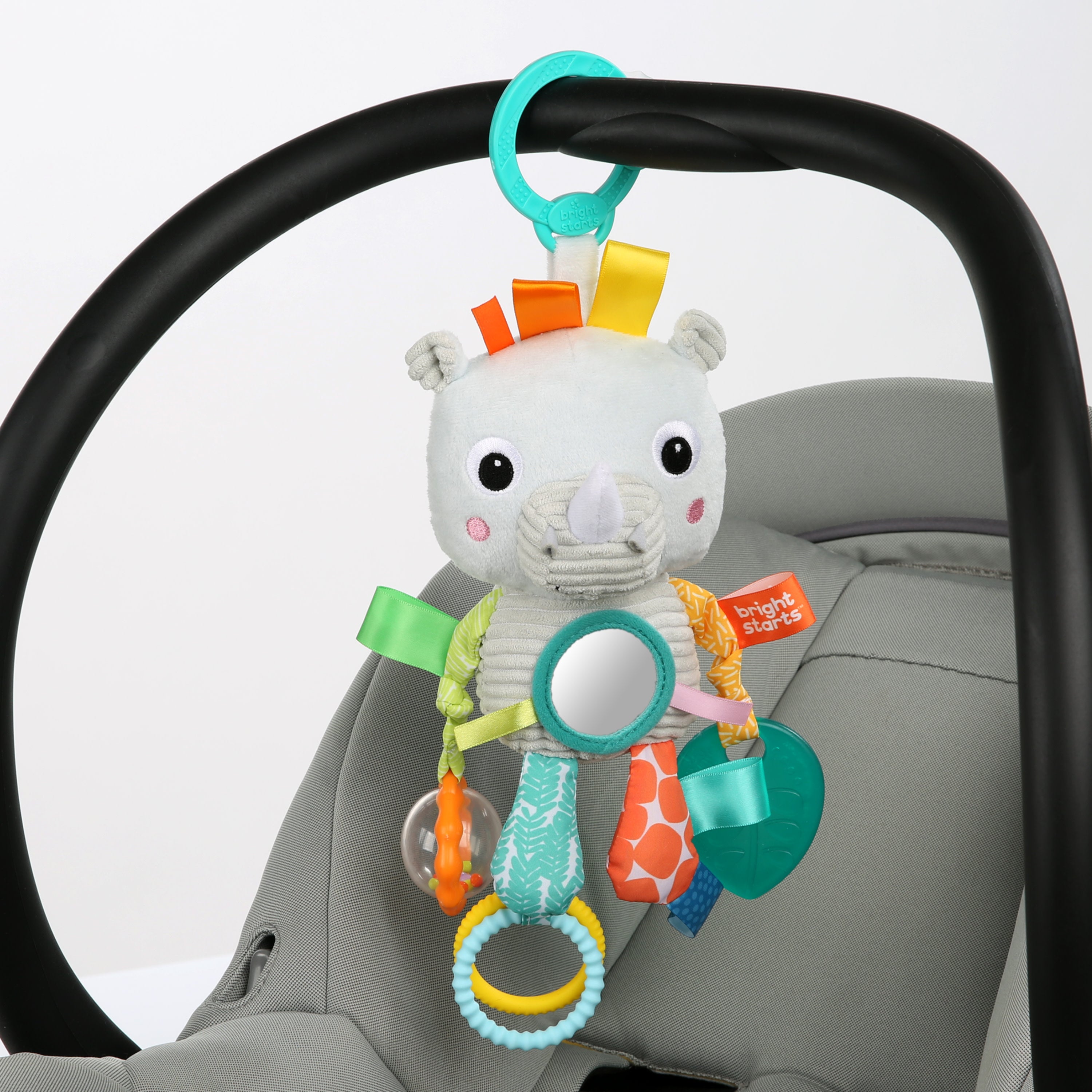 Everyday errands become a safari of fun with the Bright Starts Playful Pal newborn toy! Create a sensory experience for baby wherever you travel by clipping this take along toy to any stroller or carrier. The hanging toy will encourage the development of fine motor skills as baby reaches and plays with her new rocking rhino friend. She’ll love the crinkly-crunch of the different fabrics. The satin Taggies loops are irresistible for her to tug and touch. Watch her discover her own smile in the baby-safe mirror. With so many experiences packed into one cheerful rhino, this activity toy is sure to keep baby giggling on the go.