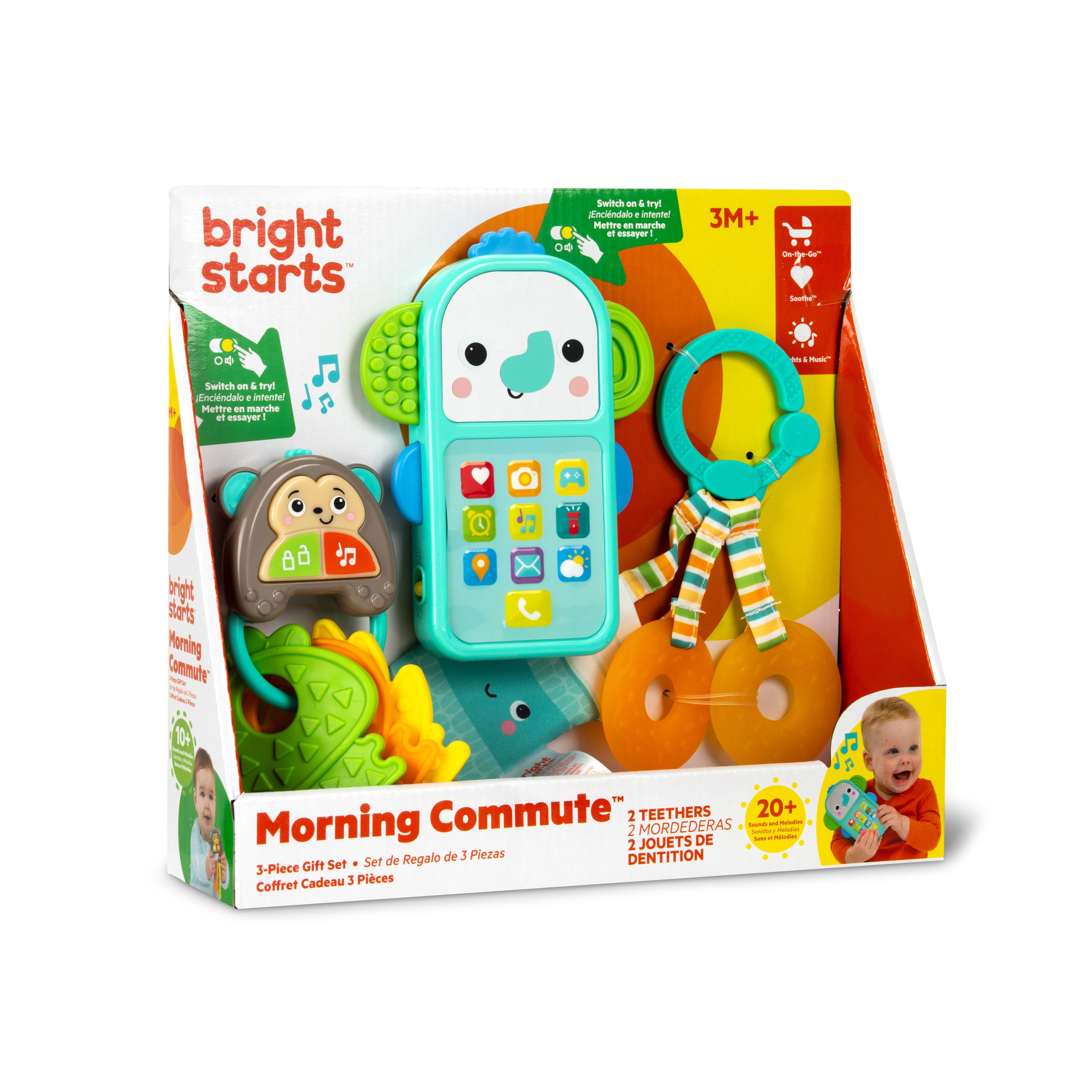 - Bright Starts My Morning Commute Gift Set includes 3 morning essential-themed sensory toys for babies: Elephone, Musical MonKeys and Perfect Trio Coffee & Donuts 3-in-1 teether toy