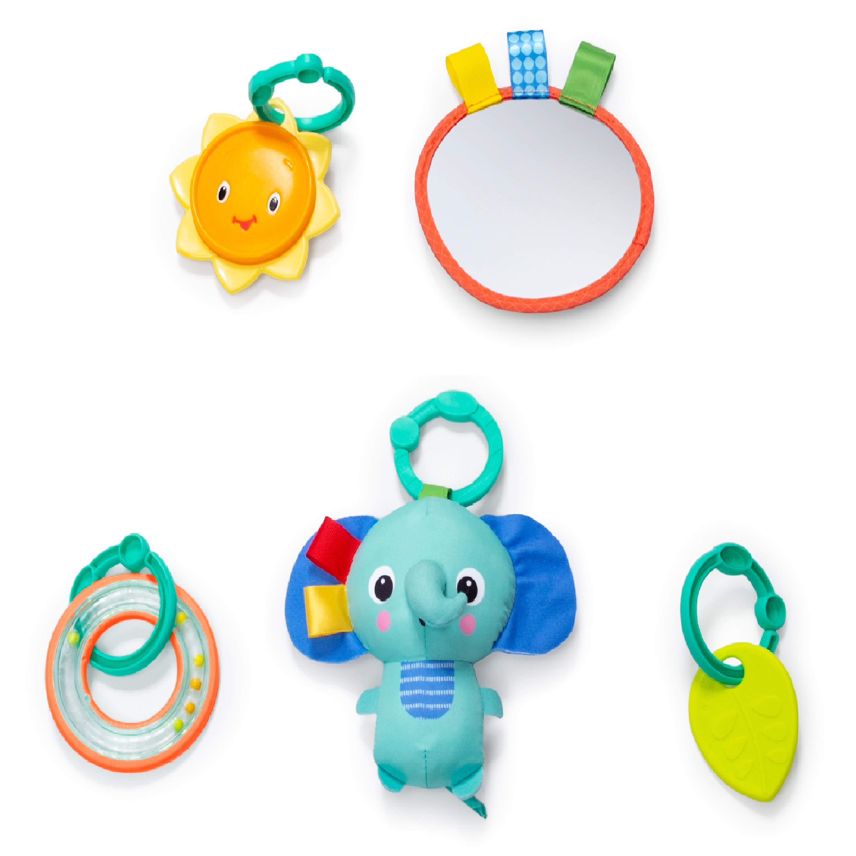- 5 On-the-Go Baby Toys: Includes a plush elephant that plays music, baby safe mirror, sun rattle, leaf toy and ring rattle. The elephant toy and mirror include satin Taggies™ that babies love to touch!