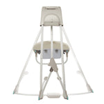 to the corresponding patch. Machine wash with cold water, gentle cycle. No bleach. Tumble dry, using low heat. Bolster – Machine wash with cold water, gentle cycle. No bleach. Air dry flat. Toy bar and toys – Wipe clean with a damp cloth and mild soap. Air dry. Do not immerse in water. Frame – Wipe the metal frame with a soft, clean cloth and mild soap. Storage – When putting swing away for storage, always store in a dry location, away from any heat sources, and out of the sun.