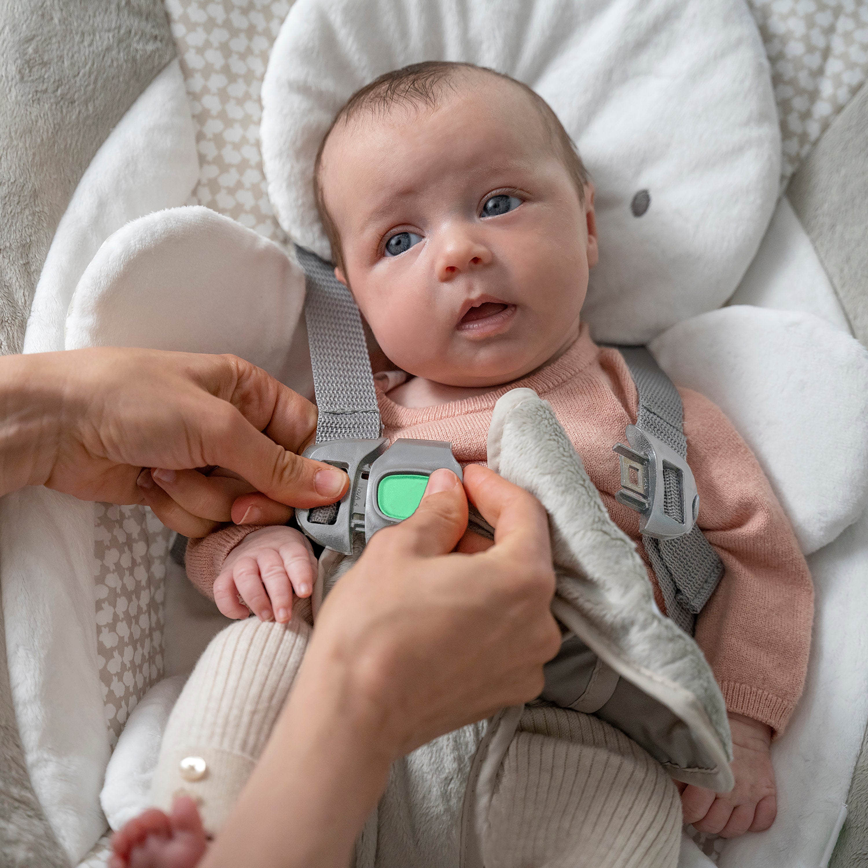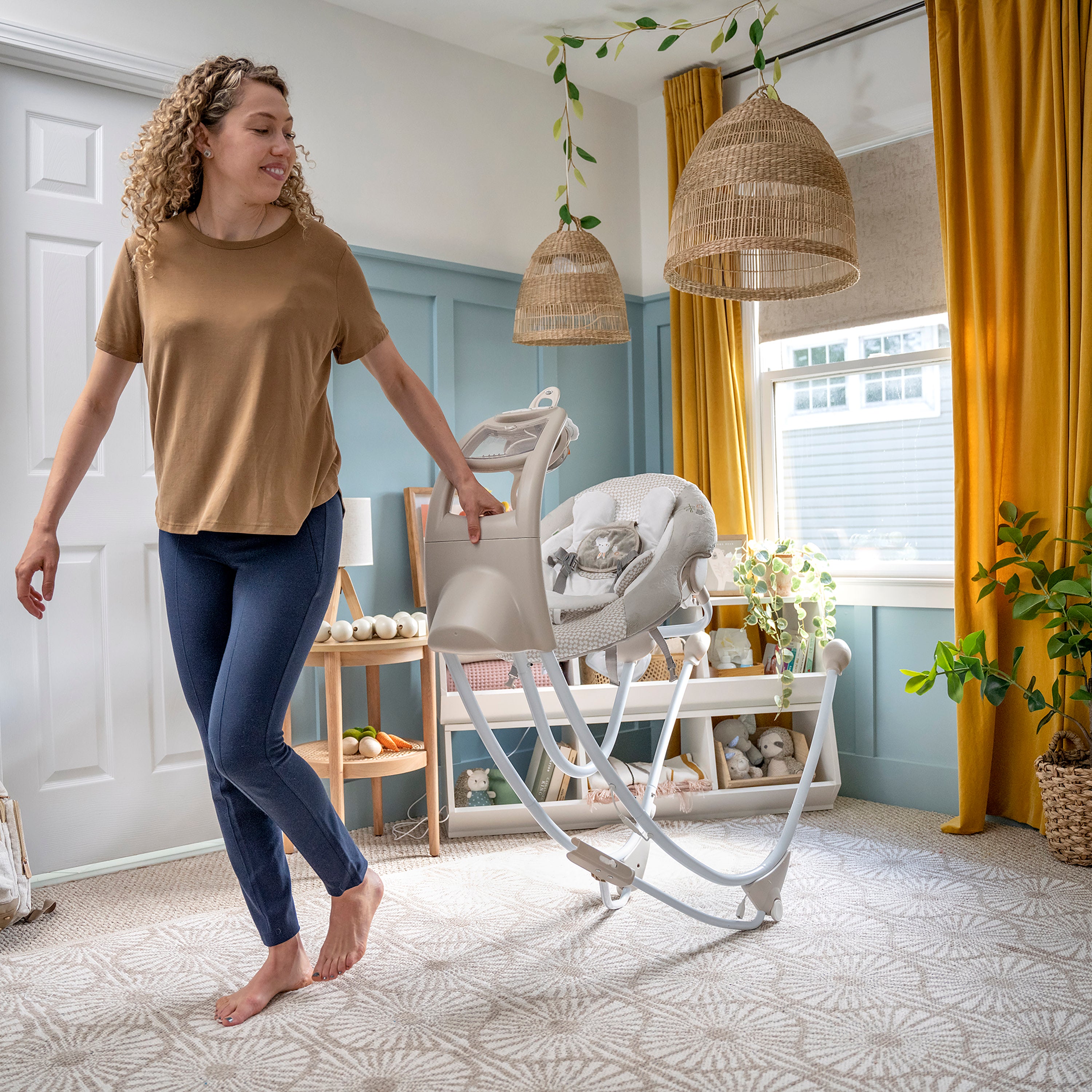 Give baby a relaxing spot to snuggle up and sway with the Ingenuity InLighten Soothing Swing. This motorized baby swing can take on almost as many tasks as you can. The electronic light-up mobile features 2 plush toys and dazzling lights, plus a mirror so babies can gaze up at their reflection. Babies love to reach and bat at the plush bunny and cloud toys included. With 2 recline positions, delicate details, and soft fabrics, baby can swing in cozy comfort. The sweet bunny shaped infant bolster gives extra support to newborns and removable when baby outgrows it. The foldable frame is lightweight and easy to transport or move from room to room. Use the ConnectMe feature to connect a smart device and play personalized music, videos, photos or more! Or soothe baby with 16 melodies, 3 nature sounds and white noise. The USB cord included powers the swing motion, music and lights. Wall AC adapter not included. Messes are no problem with the InLighten. The toys and frame are wipeable and the seat pad and bolster pillow are machine washable for easy cleaning. This parenting must-have is a great baby shower gift idea.