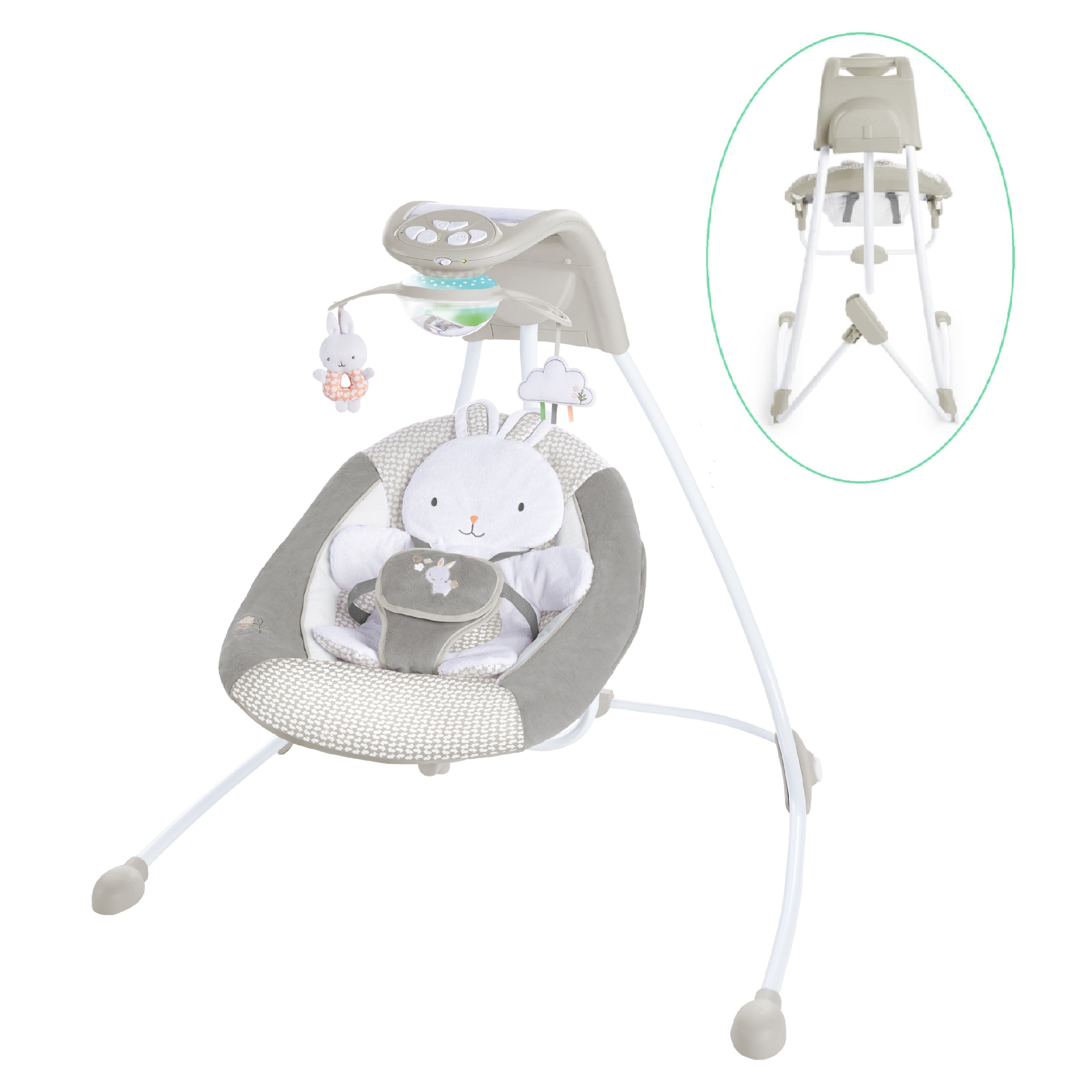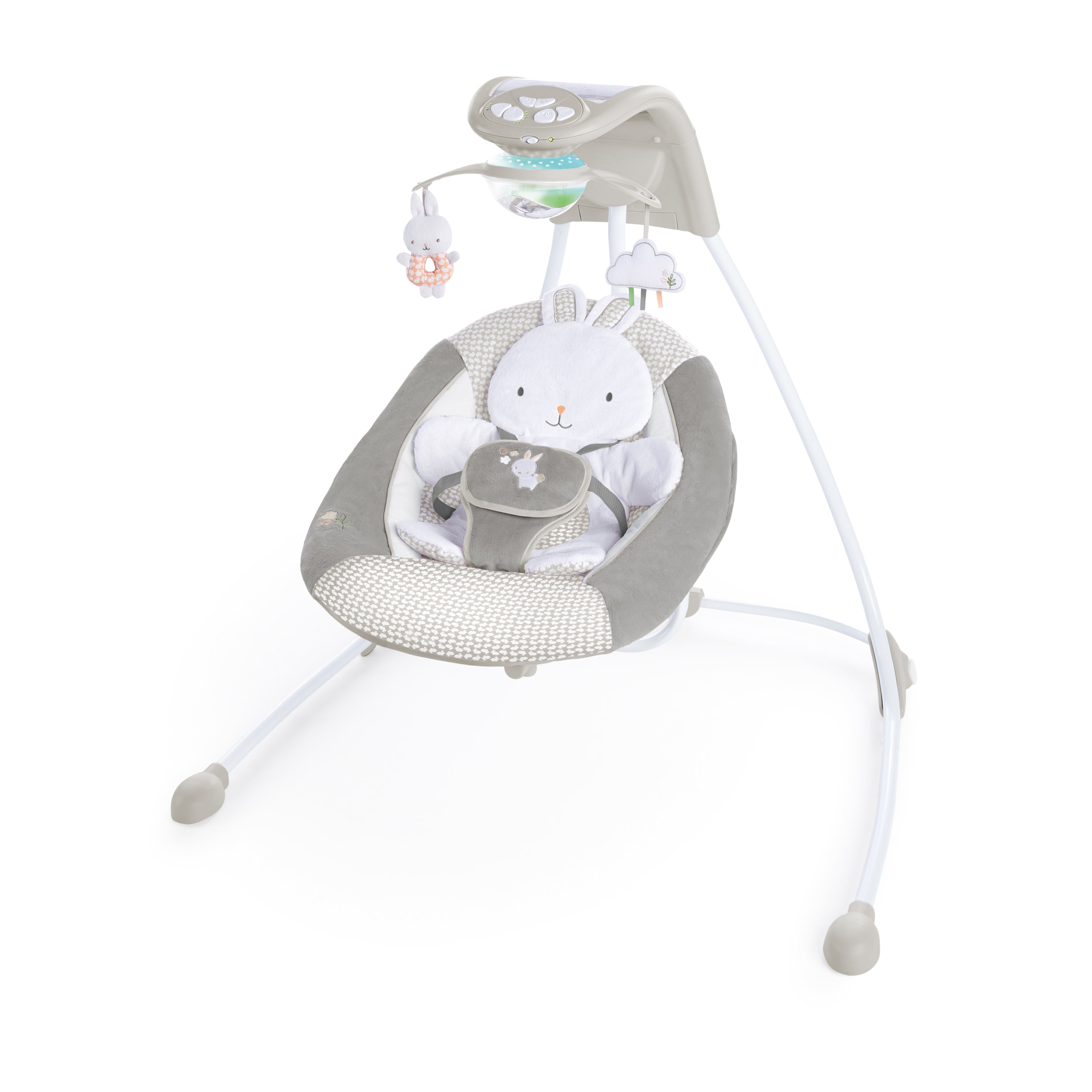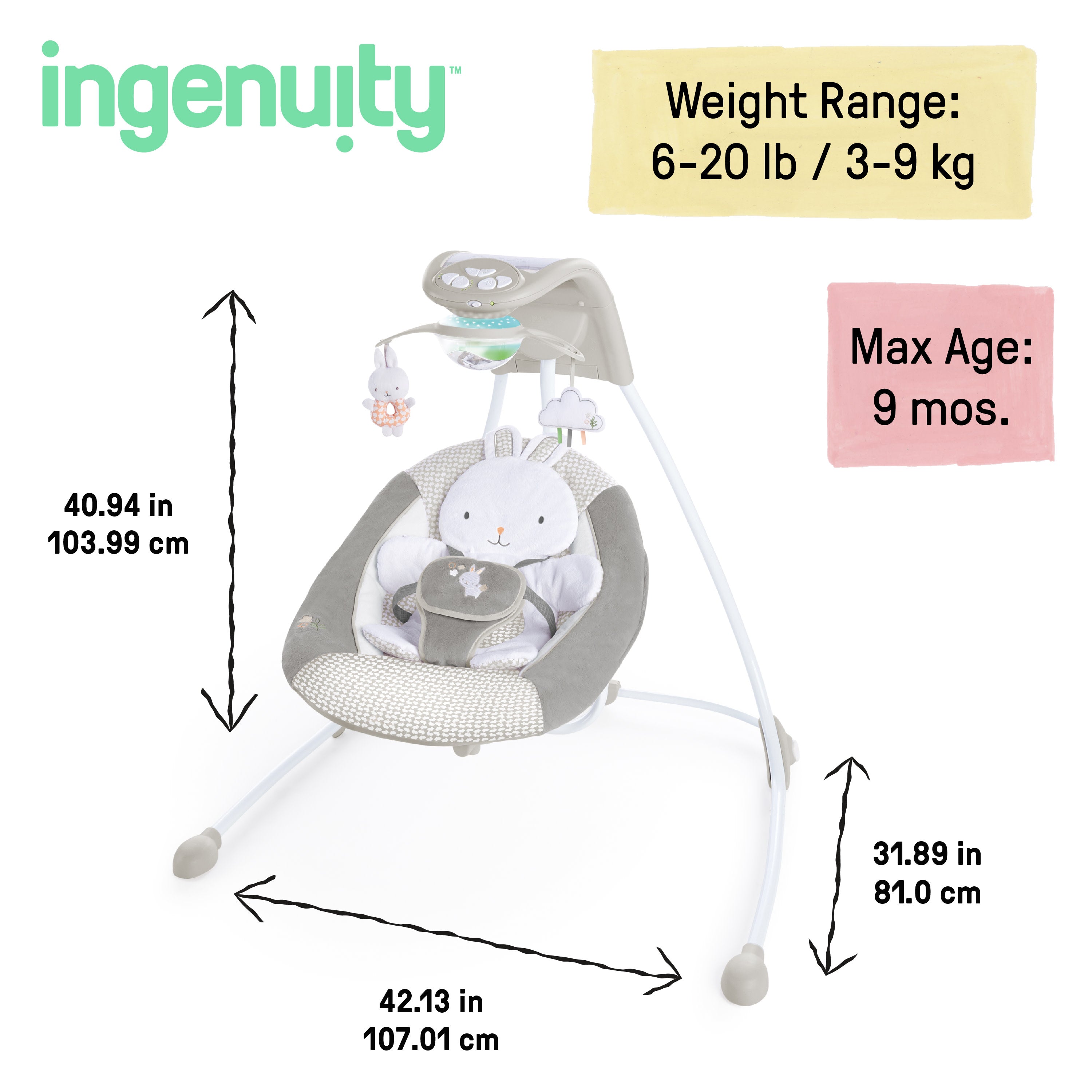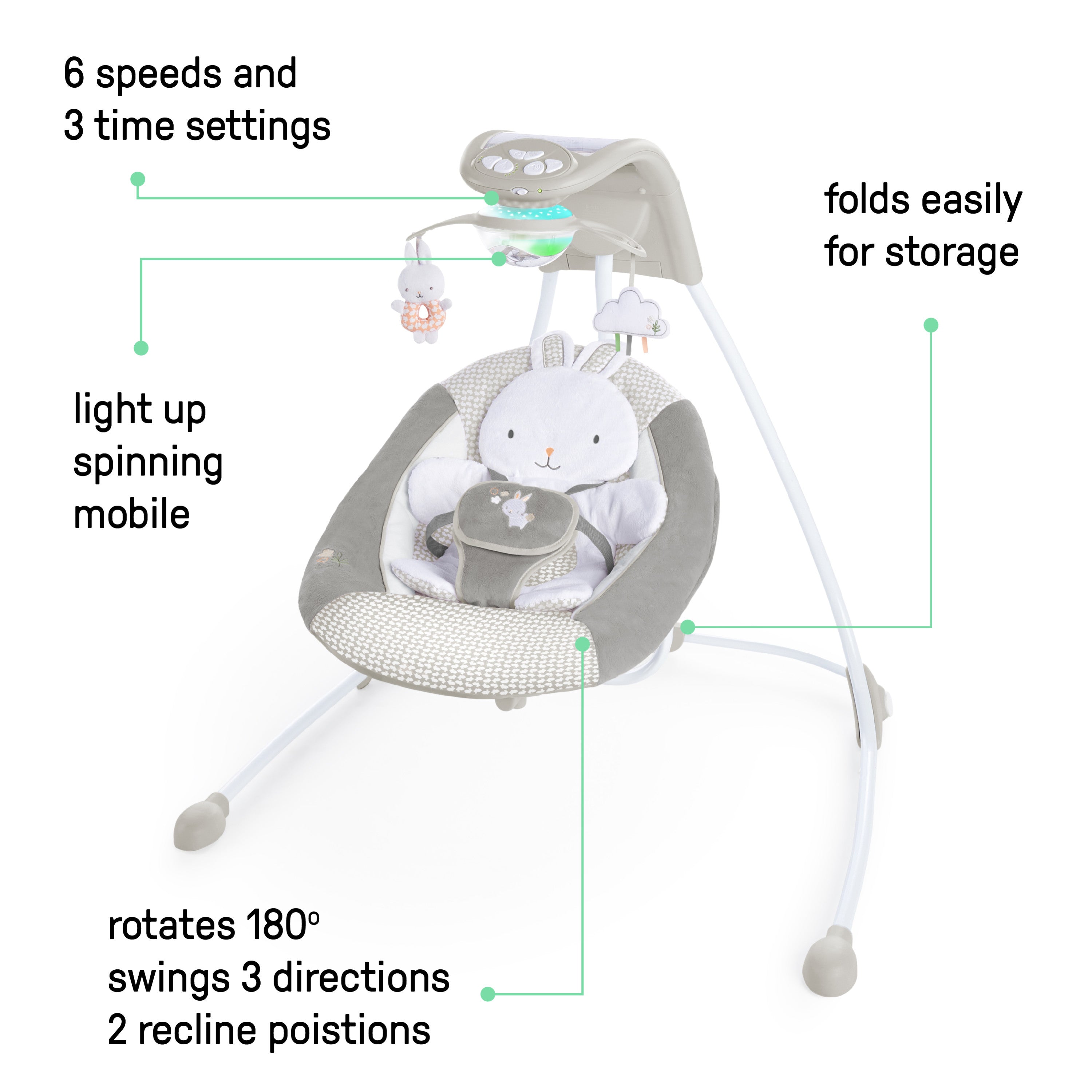 - The Ingenuity InLighten Soothing Swing rotates 180° & swings in 3 directions; unisex design for baby girl or boy with sweet bunny details