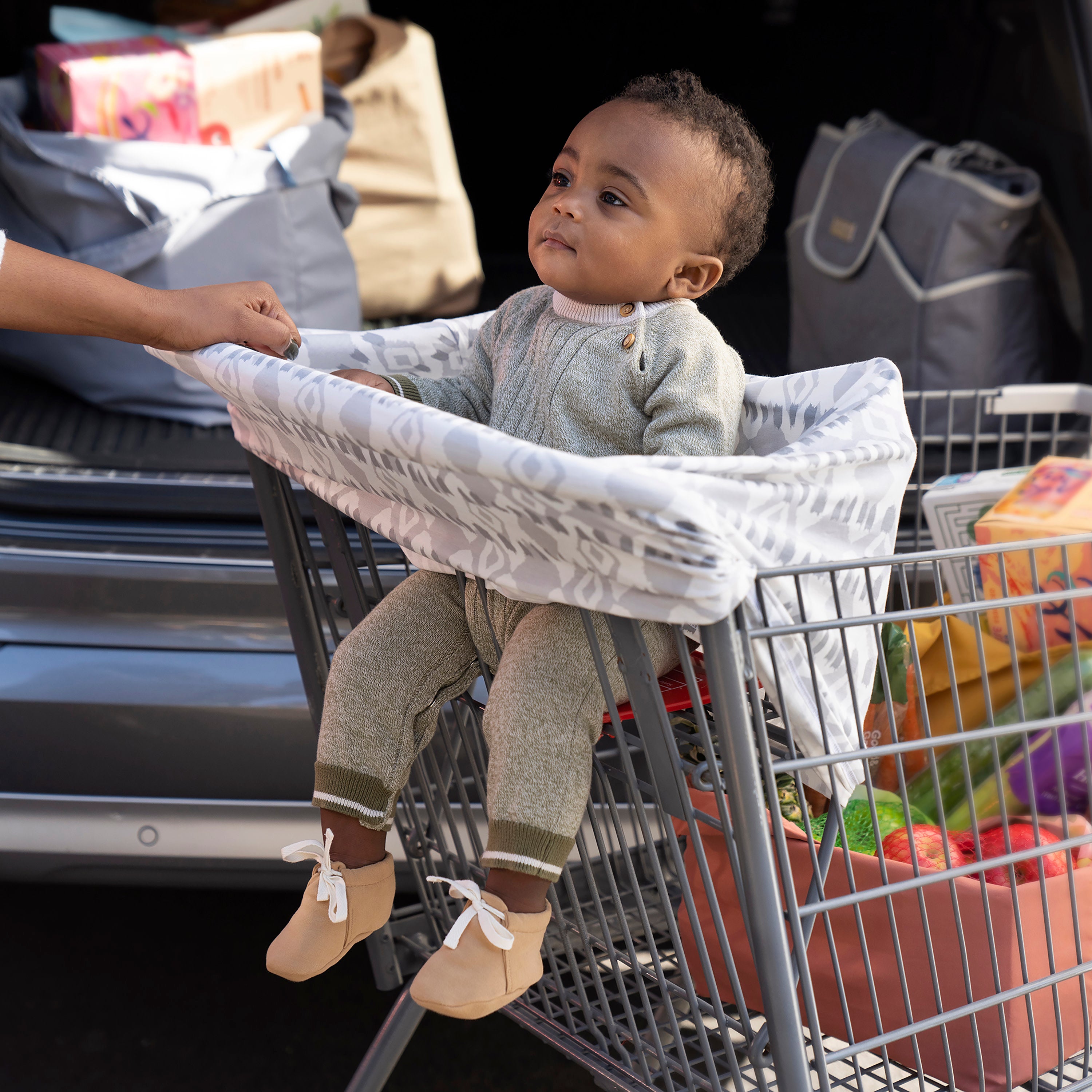 - Large fabric stretches to fit infant carriers, shopping carts, high chairs & more