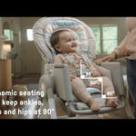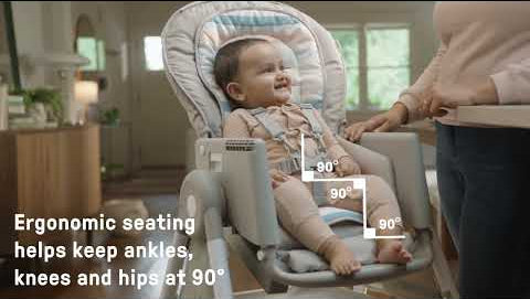 - 90-90-90 ergonomic design ensures infants sit with ankles, knees, and hips at a 90-degree angle, the optimal position for mealtimes; adjustable footrest for additional comfort; the high chair dimensions are 46.9” H x 23.3” W x 32.2” L