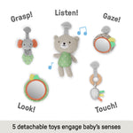 - A wooden SlimFold toy bar for easy removal and storage comes with 5 removable activity toys—sensory plush toy, textured toy, wood ring with sensory ribbon, and two mirrored toys— to encourage baby to stretch, explore, and play