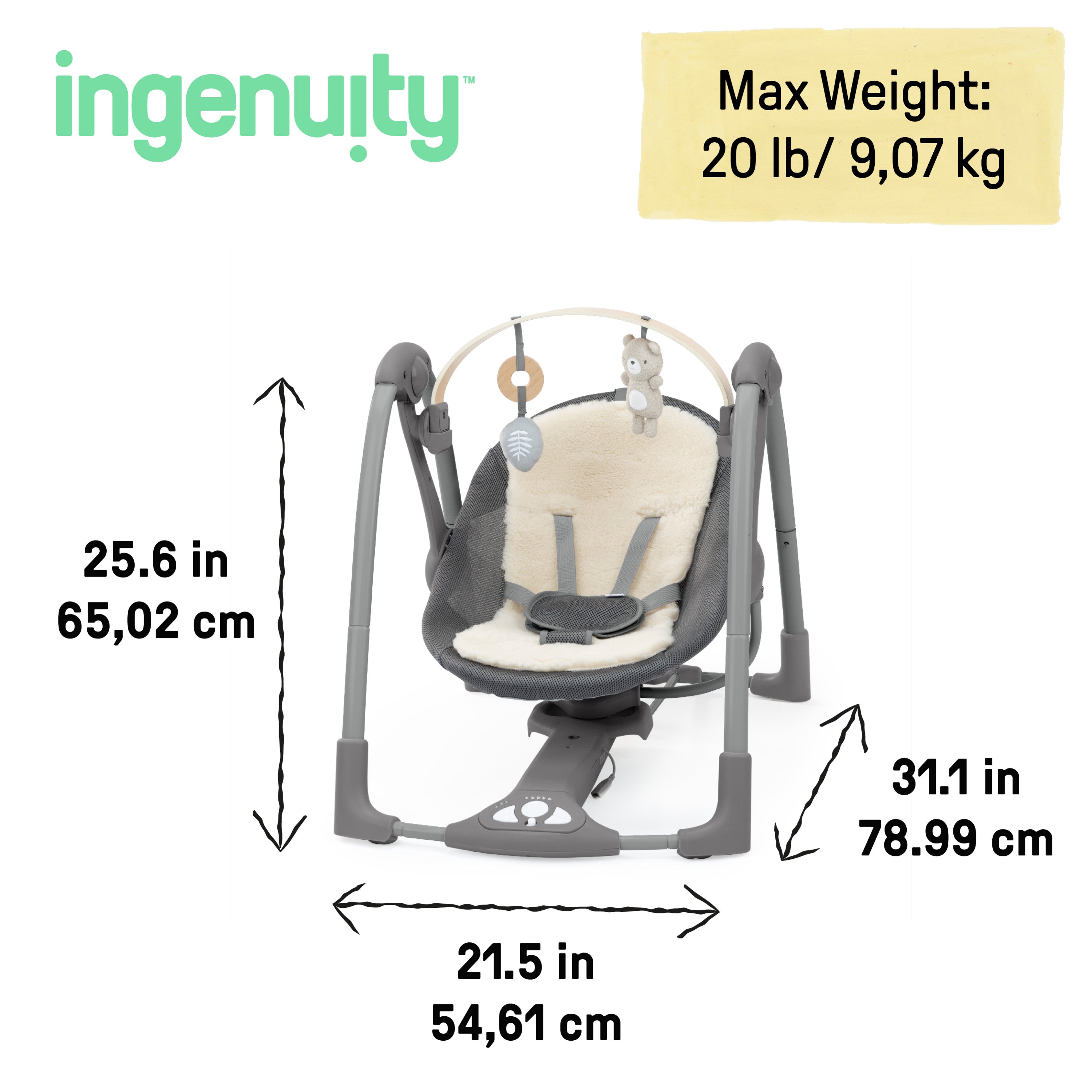 Your little one deserves a cozy environment to help keep them calm. Ingenuity's Every Season Swing 'n Go Portable Swing made with Air Flow technology is the simple, all-in-one solution to keeping baby consistently comfortable in any environment. The premium mesh fabric promotes airflow for baby and the extra cozy lambswool is 100% natural and sourced from Australia. Plus, 5 swing speeds with WhisperQuiet™ motor provides less distractions and noise for baby. A detachable toy bar, made with wood from a sustainable forest, includes a removable soft plush Nate the Bear character toy and wooden ring toy. The swing plays soft music and comforting sounds of nature to soothe baby's fussy moments. With a SlimFold™ design, the swing folds flat for easy mobility and storage and is made for babies ages 0-9 months or up to 20 pounds, whichever comes first. The Every Season Swing 'n Go Portable Swing is the perfect solution for new parents who want to keep baby comfortable, cozy, and calm all year long.