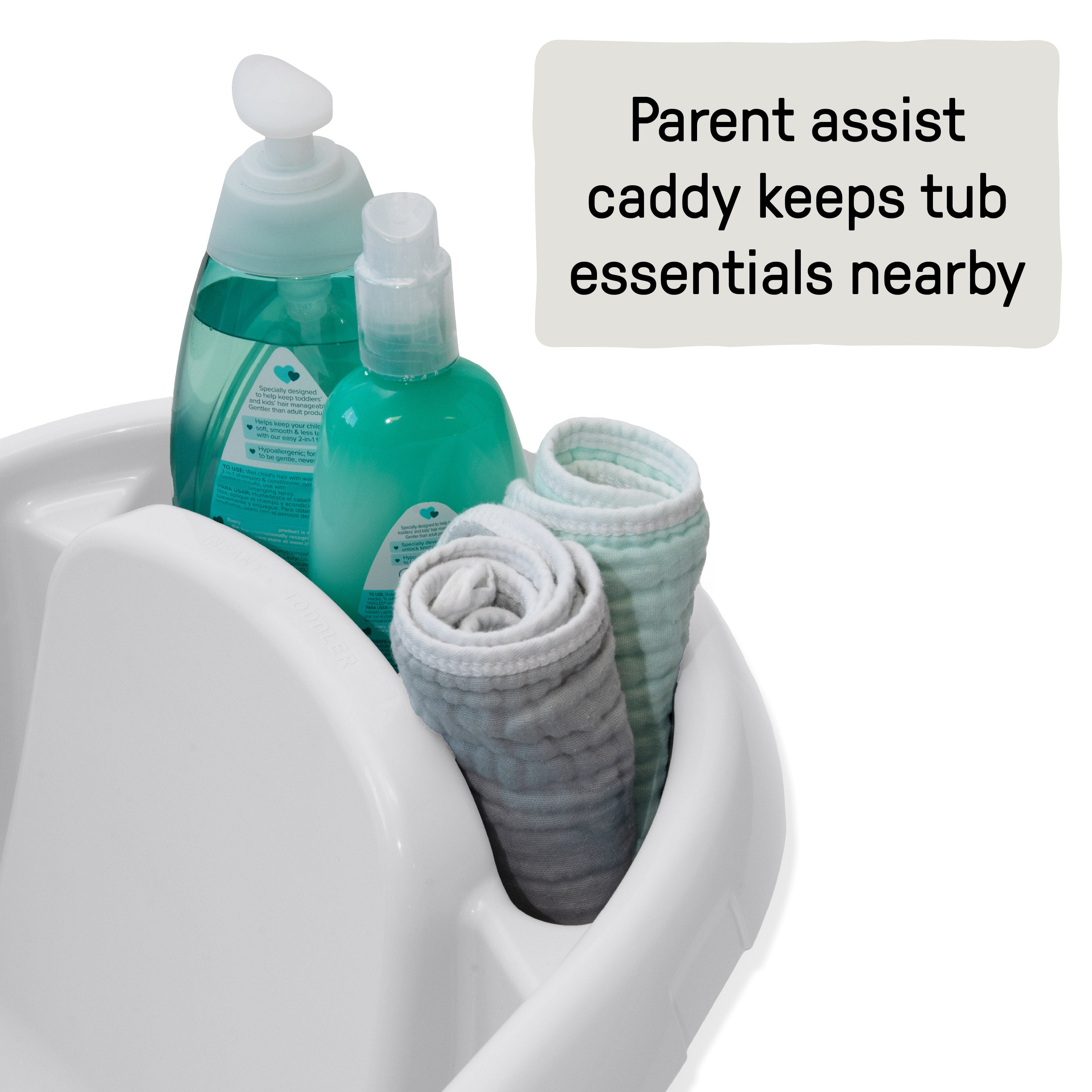 • Parent assist tray keeps bath essentials nearby so you can stay focused at bathtime