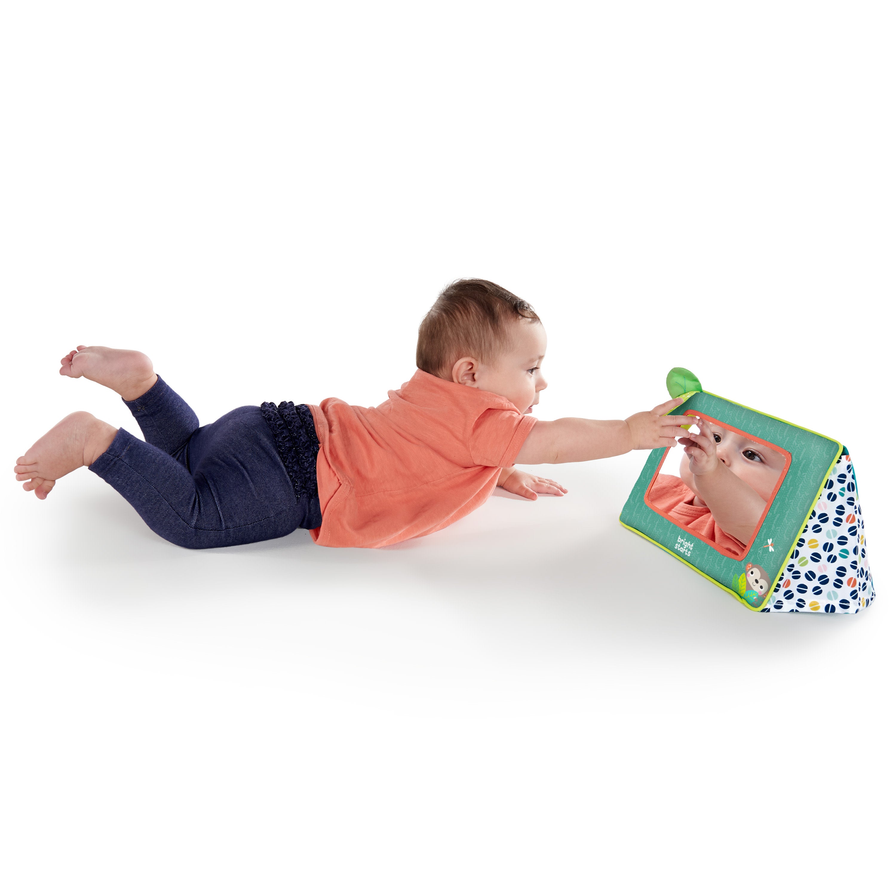 Ah, love at first sight. Who’s caught baby’s eye? Her own reflection, of course! Made for tummy time or sit-and-play, this large baby-safe mirror is perfect for silly faces and self-discovery. Watch as your wild one discovers her goofy grin for the first time. With crinkly leaves and colorful fabric, she won’t be able to take her eyes off what she sees. This little mirror from Bright Starts folds flat for easy storage and travels. No matter how you use this mirror, you’ll always have the best view — of her smile staring back at you!