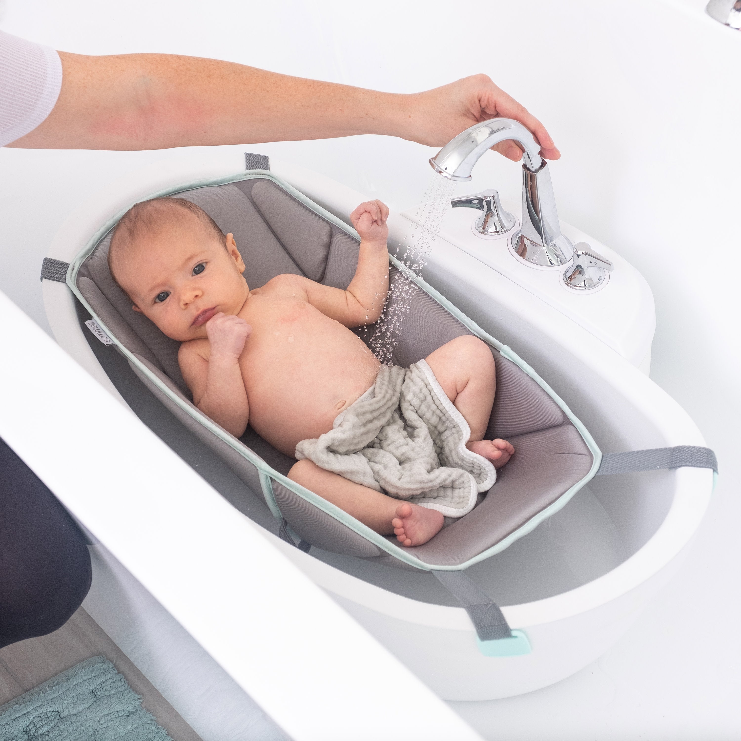 The Summer My Size Tub 4-in-1 Modern Bathing System lets you bathe your little one in style from birth up until age two with this contemporary baby bathtub! Inspired by a modern soaking tub, this sleek bath grows with baby starting with a comfy foam sling for newborns and infants which can then be removed for a spacious toddler tub. The Summer My Size Tub is double-walled and features a removable chrome-style shower sprayer and tank that can be used in an adult tub. The shower sprayer allows you to rinse baby off with fresh warm water while they enjoy playing in the realistic shower stream. A set of cups for pouring and rinsing gives your kiddo more ways to play in this multistage baby tub.