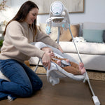 Help baby relax or engage in fun playtime with the InLighten Soothing Swing - Dakota. This motorized baby swing from the #1 Manufacturer of Baby Entertainment* features a seat that rotates 180 degrees and swings in 3 different directions. Soothe baby with a choice of comforting melodies, white noise, or nature sounds. With 2 recline positions, delicate details, and cozy fabrics, you can bring baby closer to you as they swing and sway in comfort. The narrow frame offers easy movability around the home with incorporated handle and wheels. The electronic mobile features 2 plush toys and a dazzling light show to promote visual stimulation, gross motor skills, and gross motor skills. The included USB cord powers the baby swing motion (which has 5 speeds and 3 timer options), music, and lights. Designed in the USA. Third party safety tested and approved. Wall adaptor not included. Easily wipes clean. This parenting essential makes for a great baby shower gift! From the #1 Manufacturer of Baby Entertainment* (*Circana, US Dollar Sales, Jan-Dec ‘24).