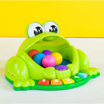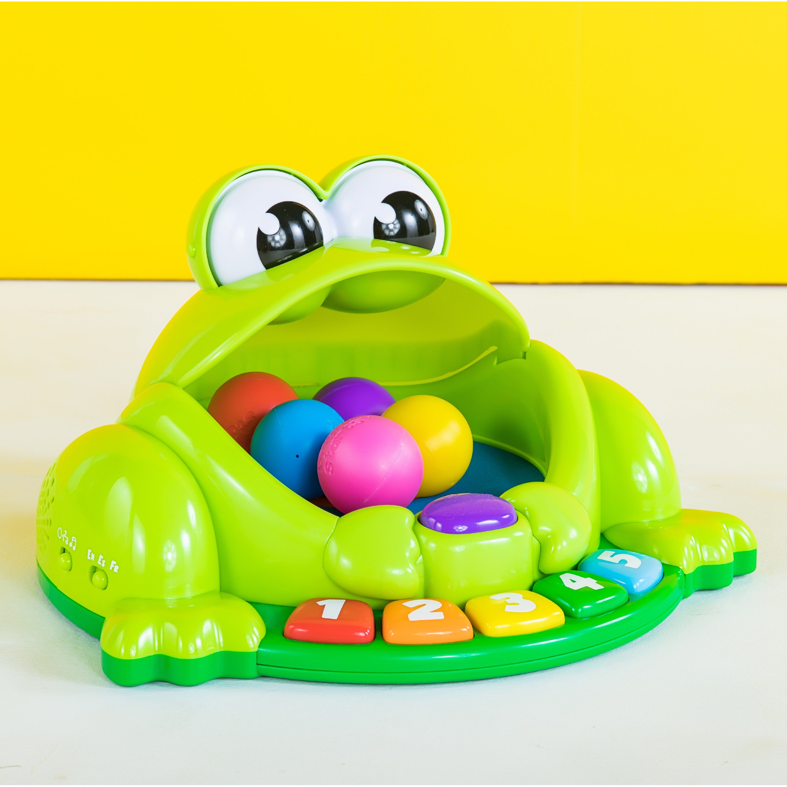- Feed balls into the frog's mouth, press the button and watch them bounce around on the trampoline-like surface