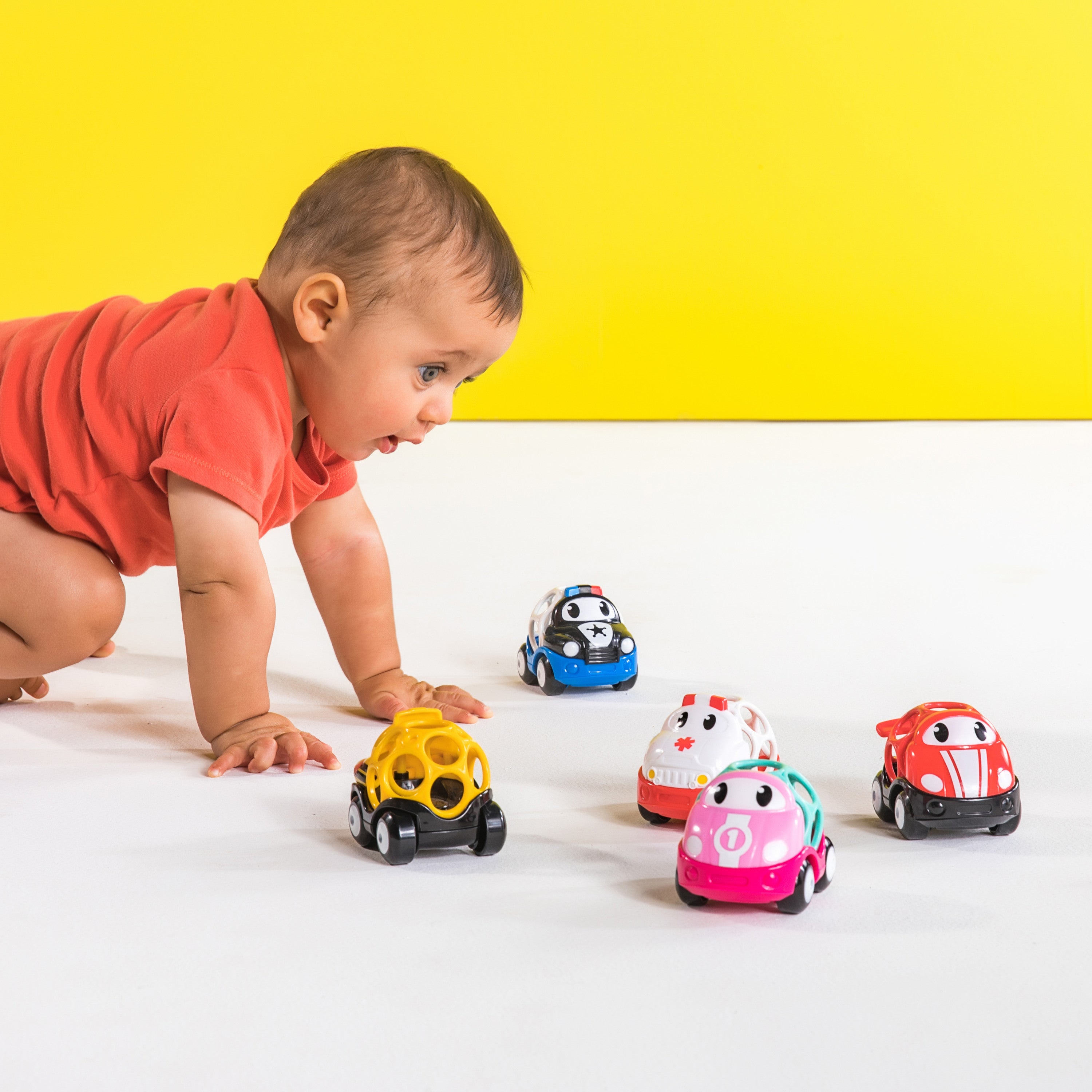 Beep, beep! Baby’s at the wheel. Watch her roll around town with this city-themed Go Grippers set. The easy-to-grasp signature Oball design is virtually indestructible too, so these little cars can handle any bumps in the road. Made with geometric finger holes, it’s easy for even inexperienced hands to grab and go. Will she go zigging and zagging with the striped race car? Or will she go running and rescuing with her favorite firetruck? Multiple car choices make imagination your first destination.