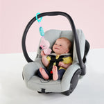 With a flap of a feather or a shimmy and shake, this flamingo sings a sweet chime for your baby. Bright Starts presents the Chime Along Friends Flamingo toy that helps encourage development of fine motor skills wherever you go. Your silly sweetheart will practice reaching and swinging her new feathered friend hanging above. The extra soft and plush newborn toy is made with mixed materials that baby will love to touch. Easily travel with this light pink pal by attaching it to your stroller or carrier. Now baby can fly into fun when you’re on the go!