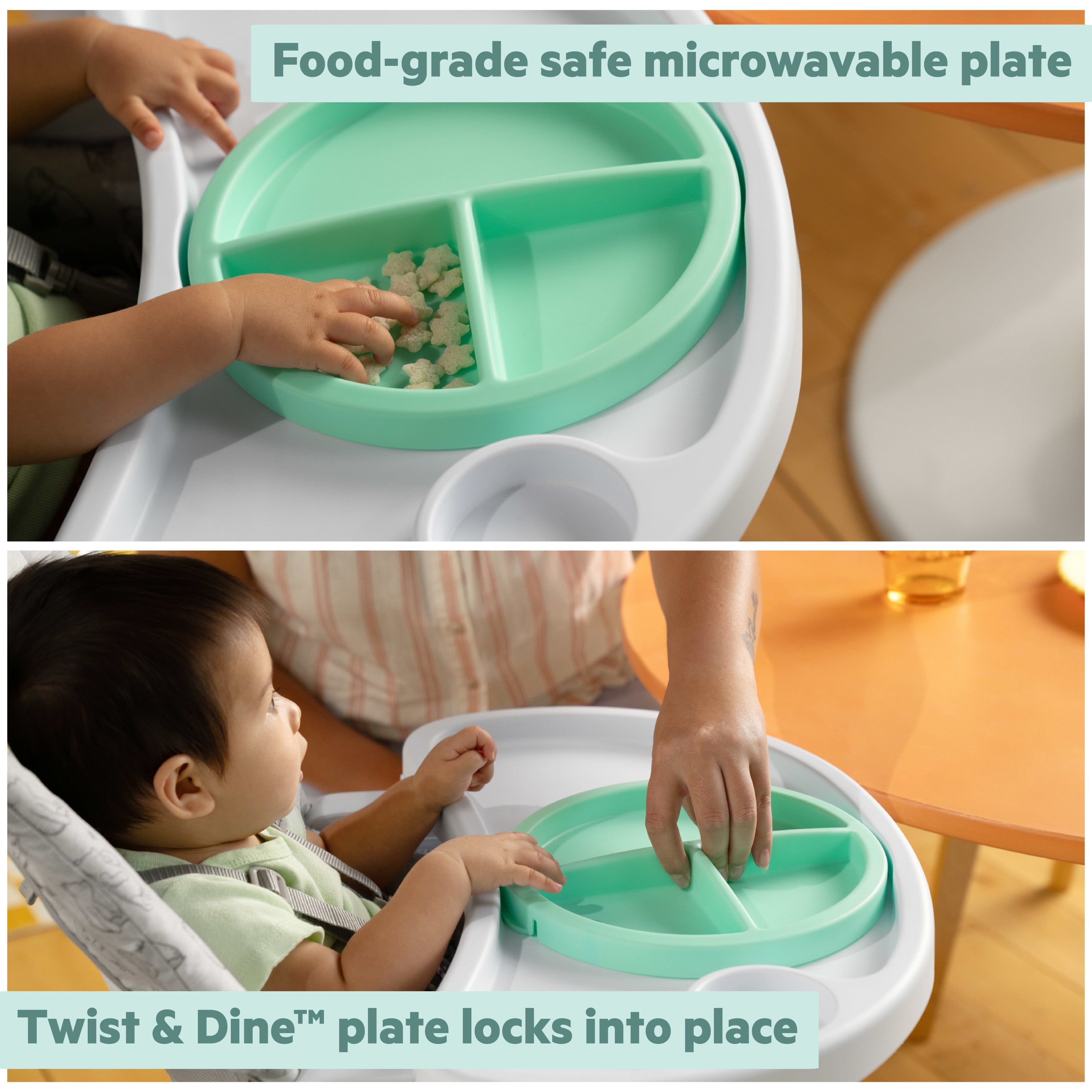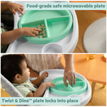 - 3-section Twist & Dine plate is the perfect companion as baby learns to self-feed; the food-grade safe plate locks securely in place, preventing little ones from tossing it to the floor