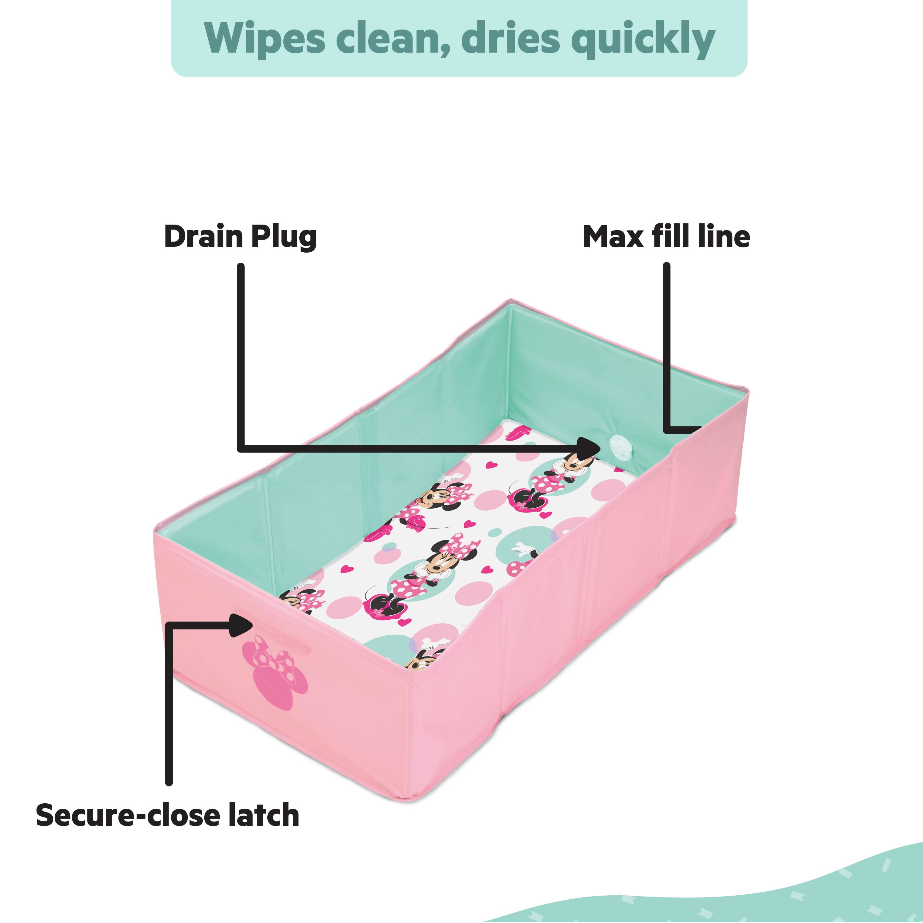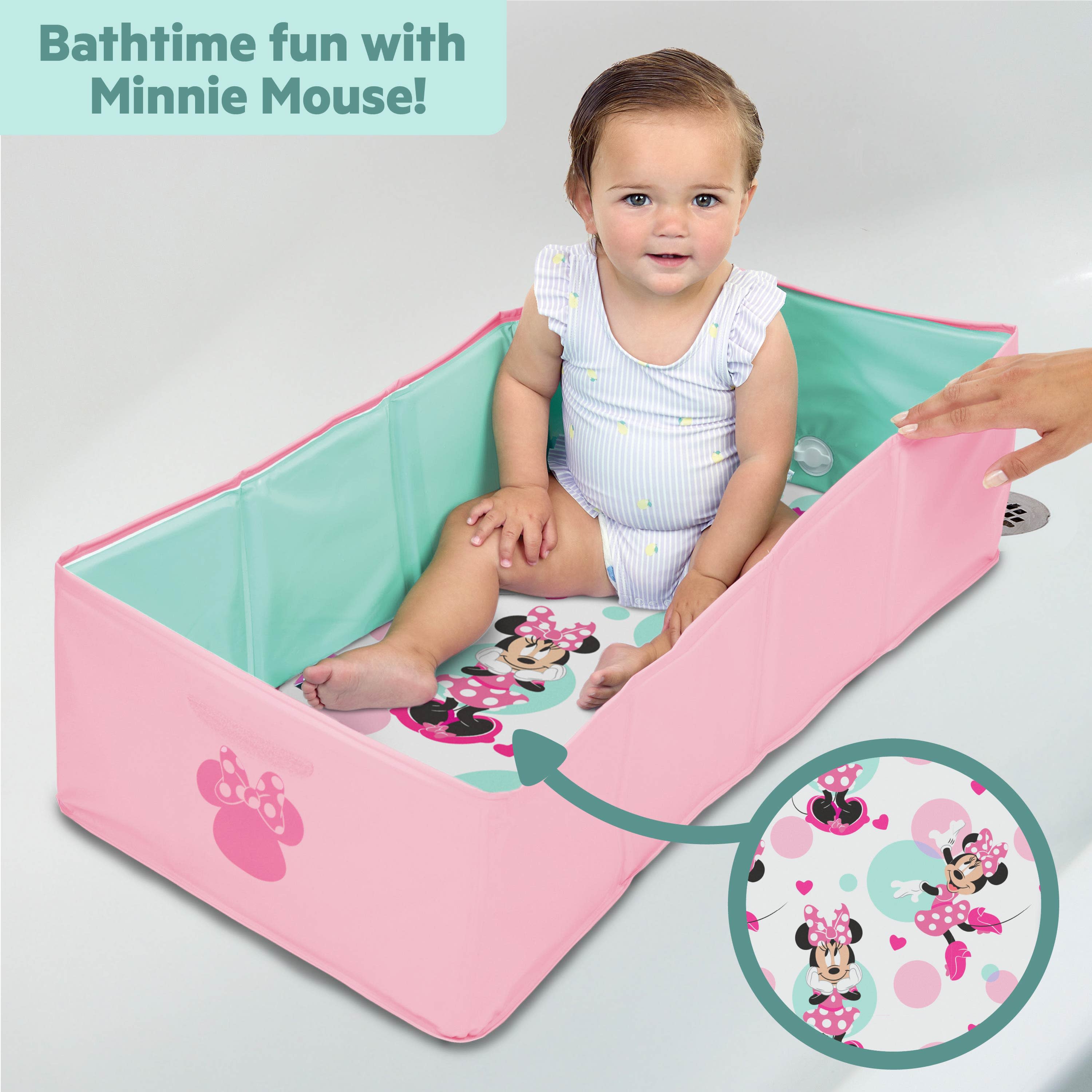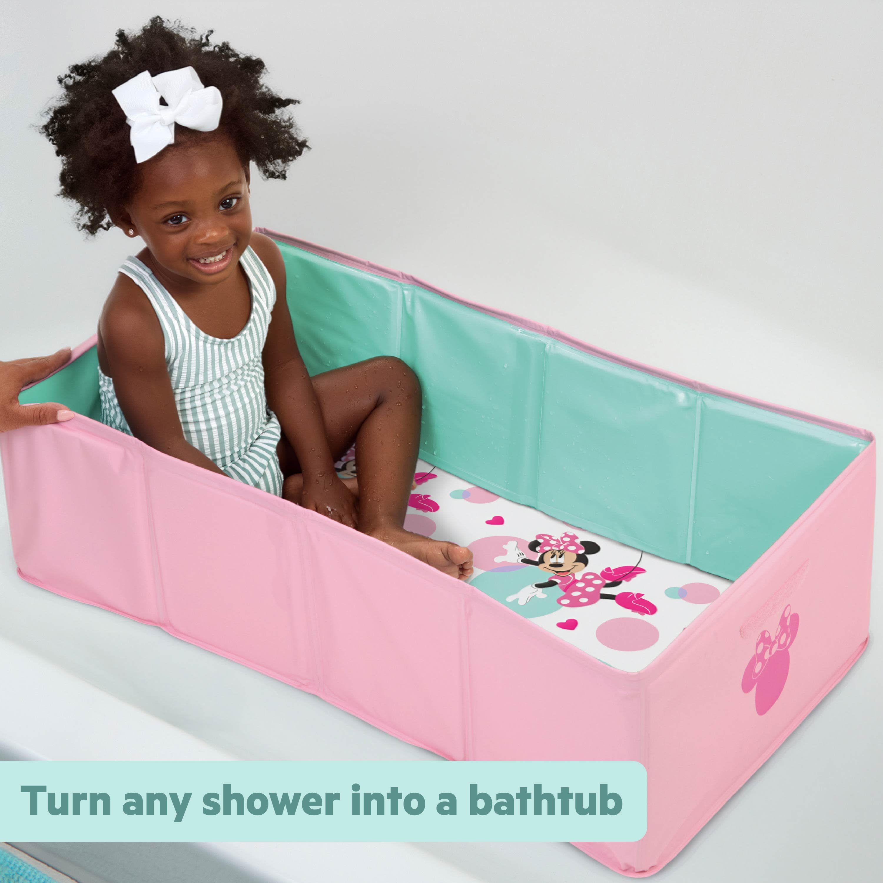 - Magically transform any shower to a bathtub with the Disney Baby Minnie Mouse Tuckaway Travel Tub; simply unfold this waterproof lined tub and fill with water