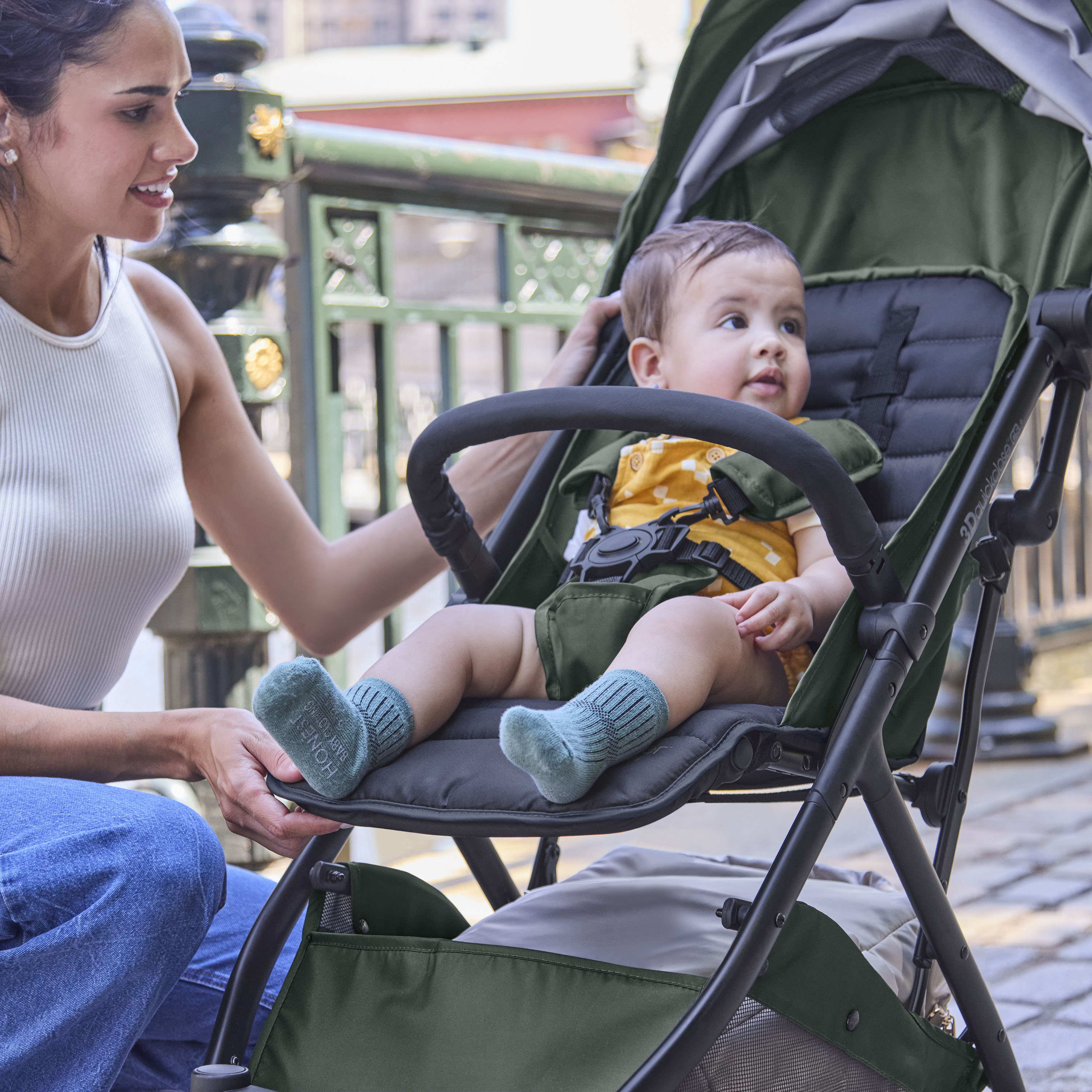 Keep things light without sacrificing safety (or style!) with the Ingenuity 3Dquickclose CS+ Compact Fold Stroller. Designed by a Top Manufacturer of Umbrella Strollers*, this lightweight stroller is a parent must-have that’s perfect for quick trips or long vacations. It offers a “quick close” feature that allows the user to fold it in seconds – with just one hand! The sleek design offers all the features of a full-size stroller including a five-point safety harness, large storage basket, a multi-position recline, a child’s cup holder, extra-large canopy, and a removable bumper bar for easily getting your little one in and out of. Adults will enjoy a cup holder and a cell phone holder, a peek-a-boo window so you can check in on your little one through the canopy, and a storage pocket. At only seventeen pounds, it’s convenient for travel or everyday use and is compatible with select infant car seats, so you can start using it as soon as your baby comes home! *(#1 Lightweight Stroller* (*Circana, US Dollar Sales, Jan-Dec ‘24))