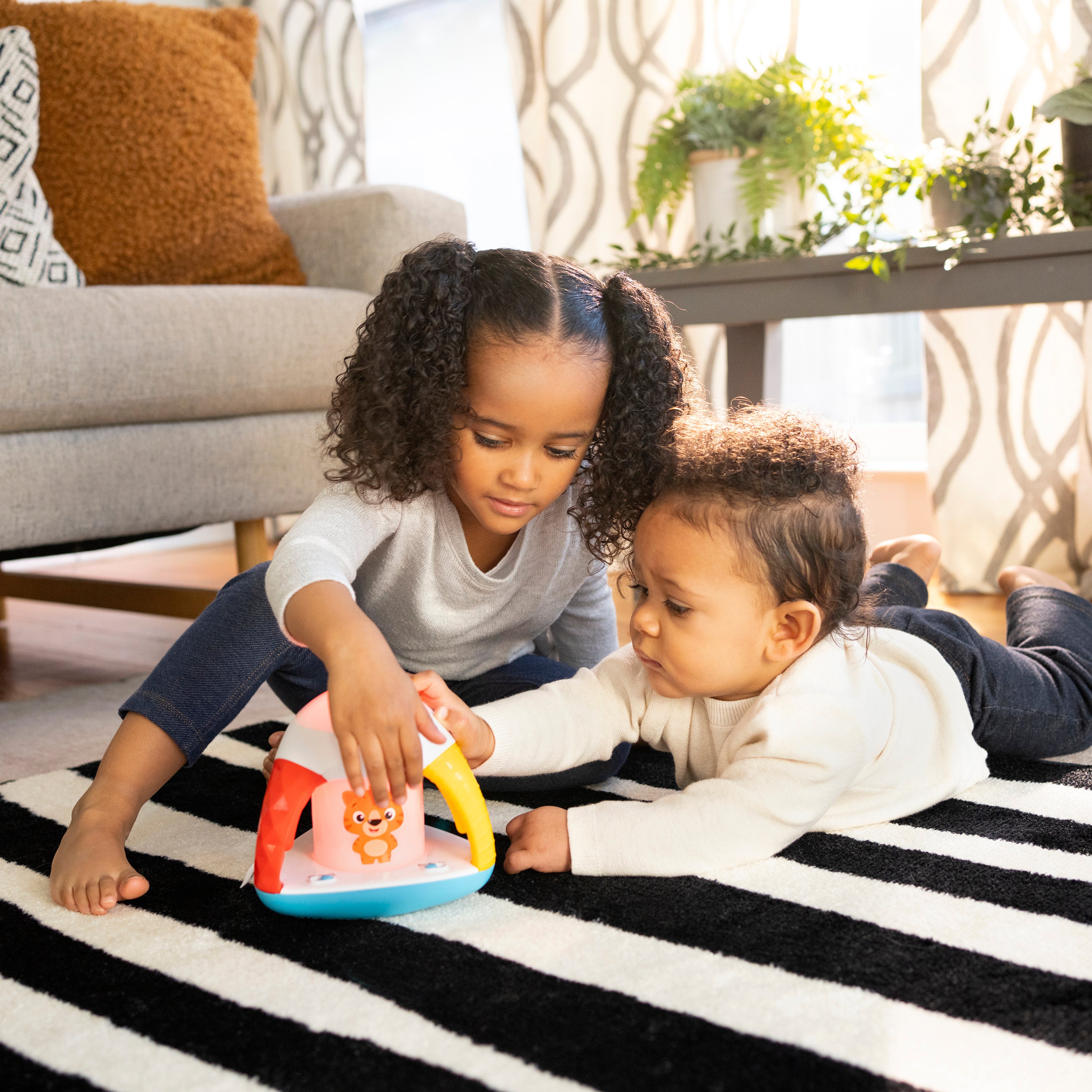 Discovery is prismatic with Baby Einstein’s Curiosity Kaleidoscope™ Electronic Toy. Squeeze the colored handle to see the corresponding hue light up in the kaleidoscope dome. Baby will hear the name of the color as she sees the toy glow! Experiment with color mixing by grabbing two handles at once. A musical soundtrack will keep baby’s attention as she discovers primary and secondary colors through cause and effect learning. Encourage cognitive development through play!