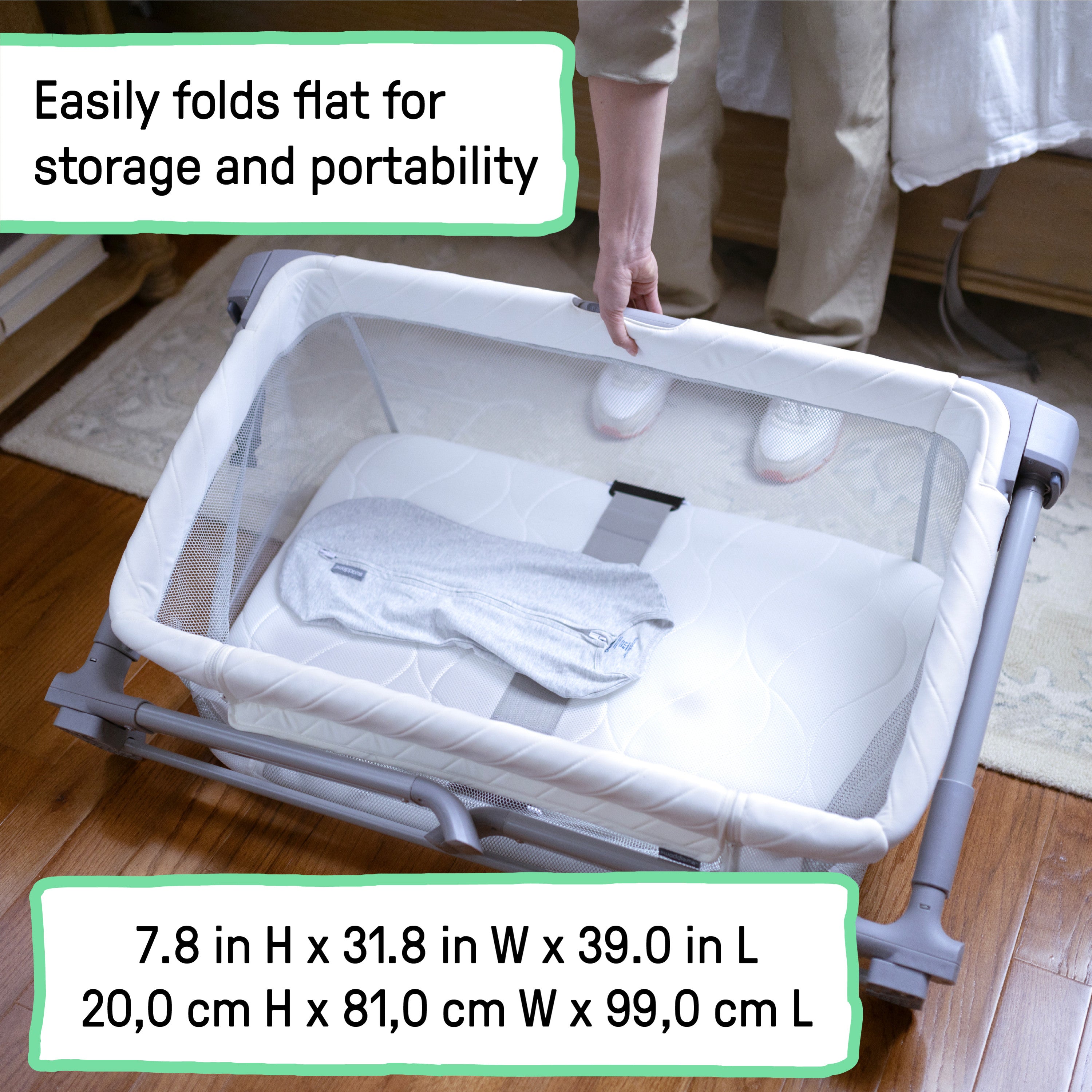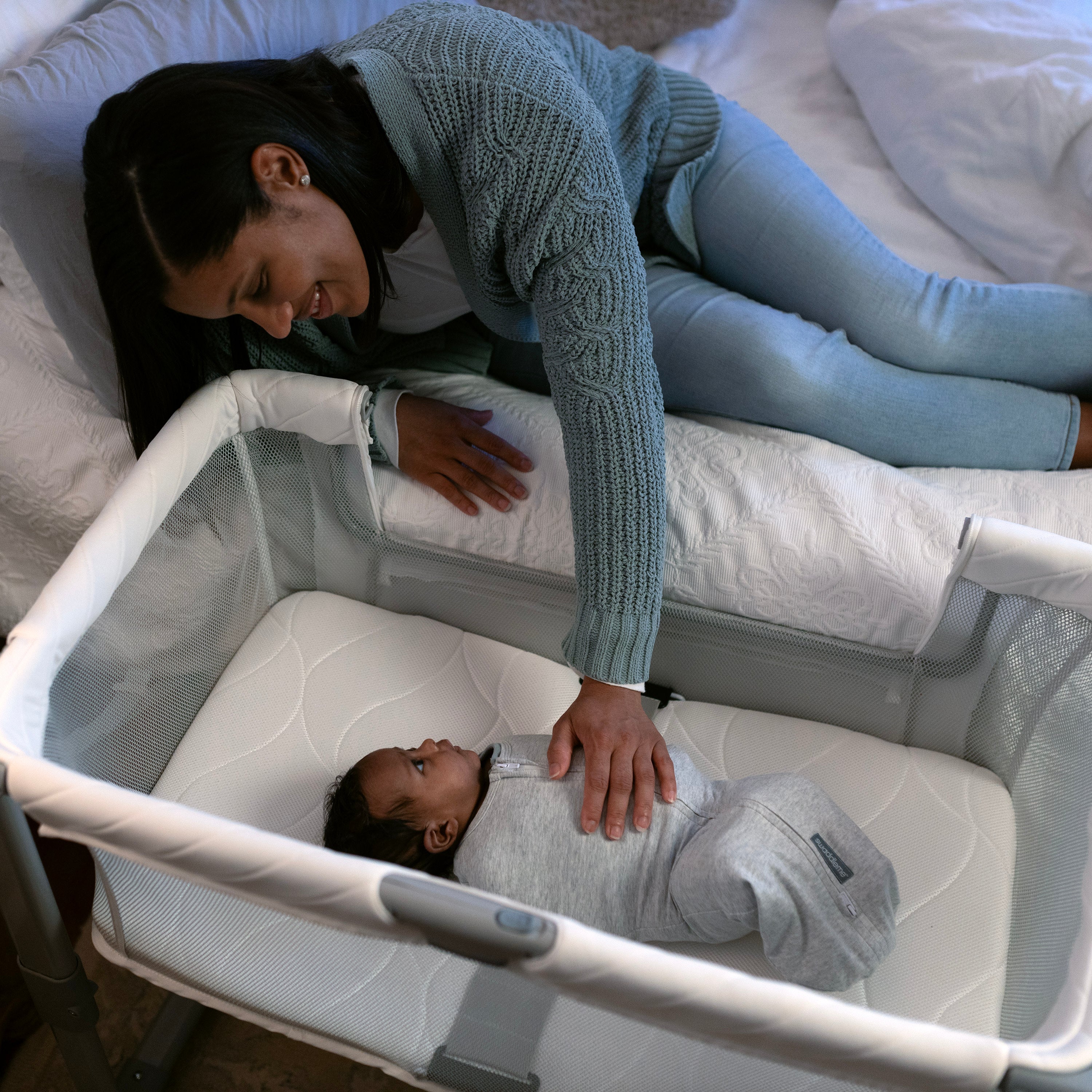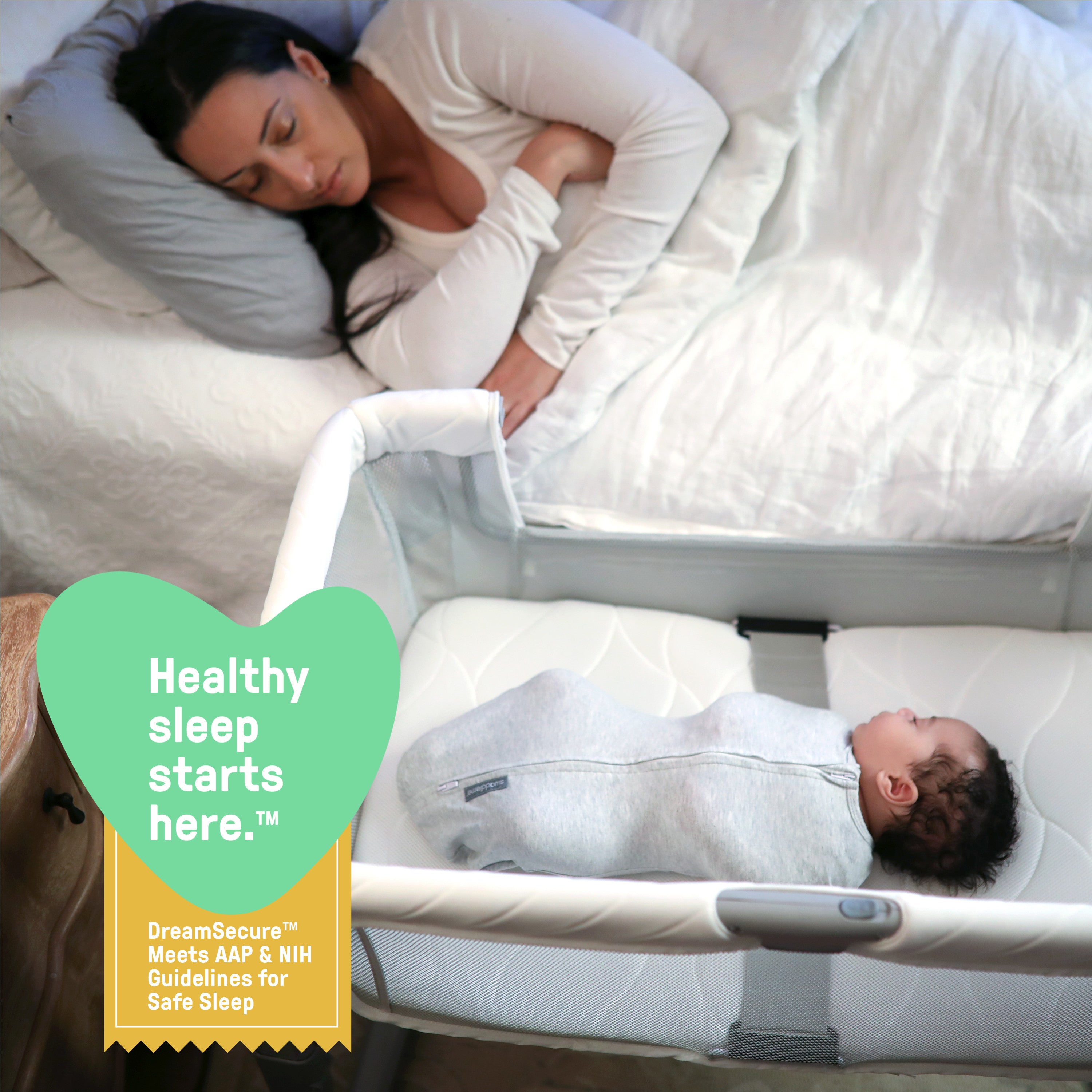 We know getting your little one a full, safe night's rest is one of the hardest and most important jobs for a new parent. That's why we designed the DreamSecure 2-in-1 Co-Sleeping Bassinet. Developed in consult with child sleep experts, the DreamSecure is the only bassinet designed to meet all National Institute of Health and American Academy of Pediatrics safety guidelines. This unique bassinet exceeds federal testing standards and meets AAP safe sleep guidelines. The removable, patent-pending DreamSecure Pod, designed by the #1 SwaddleMe brand, keeps baby on their back in the ideal sleep position all night long. Additional DreamSecure Pods sold separately. AirLoom+ technology and mesh sides provide greater breathability so baby stays comfortable throughout their sleep, any time of day. Anchor straps secure the bassinet tightly to your bed to provide 7 adjustable height positions, so you can keep baby close. A drop-down side can be used in bedside sleeper mode for easy visibility and reach. This bassinet is ready to use right out of the box and folds down for easy transport, making it simple for new and experienced parents alike. Dream Secure provides all AAP & NIH guidelines for a safe sleep environment. Third party safety tested and approved for baby.