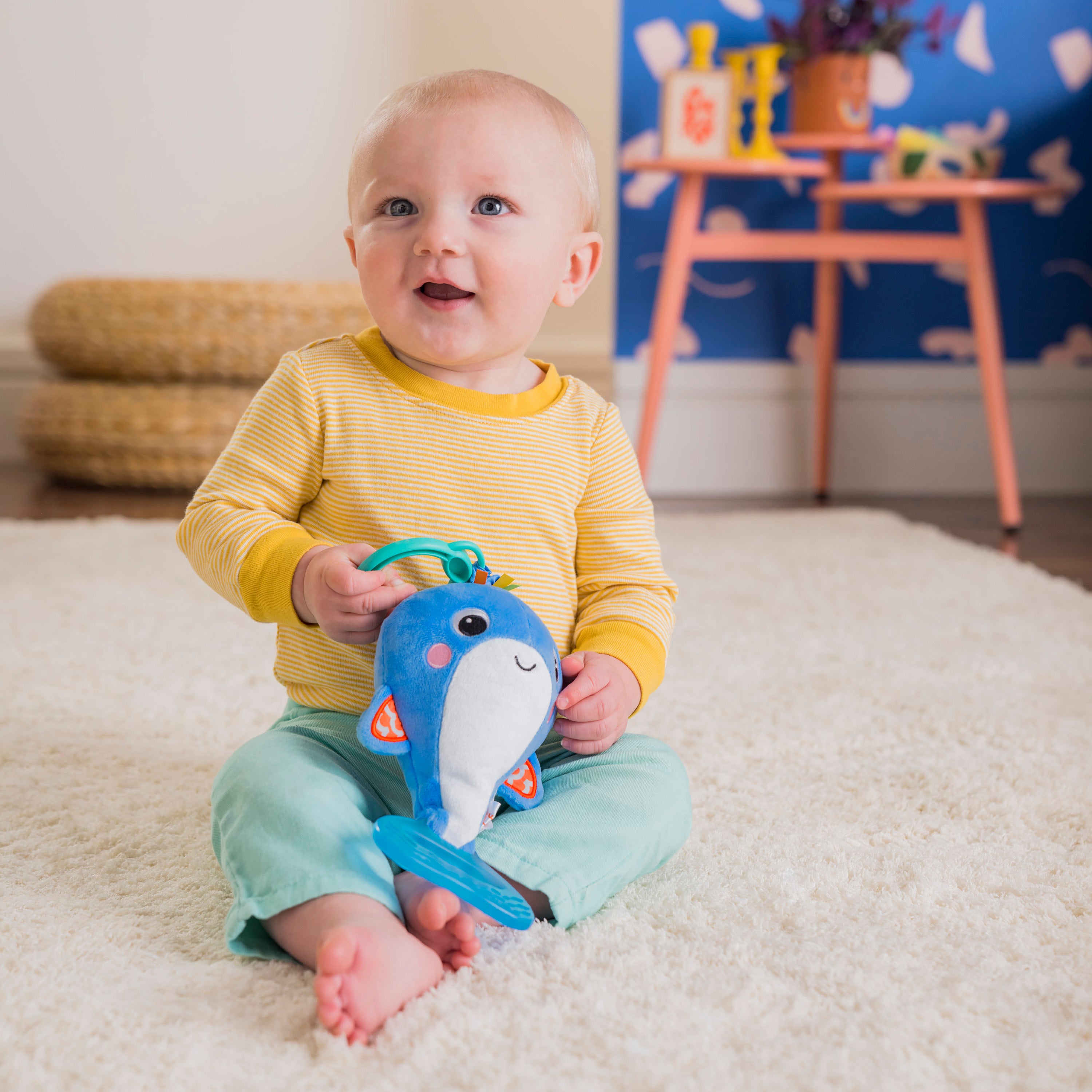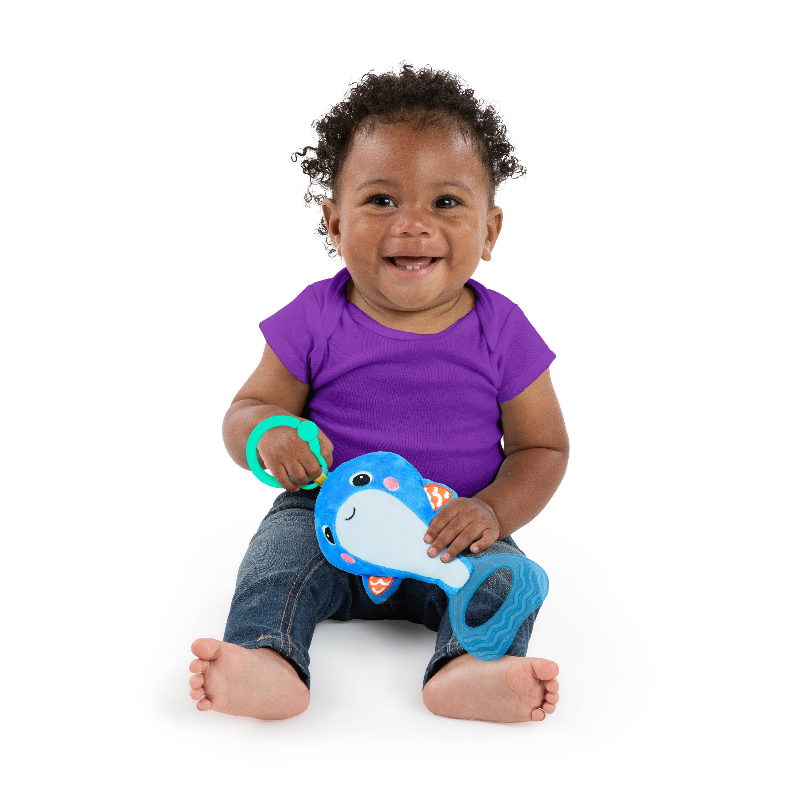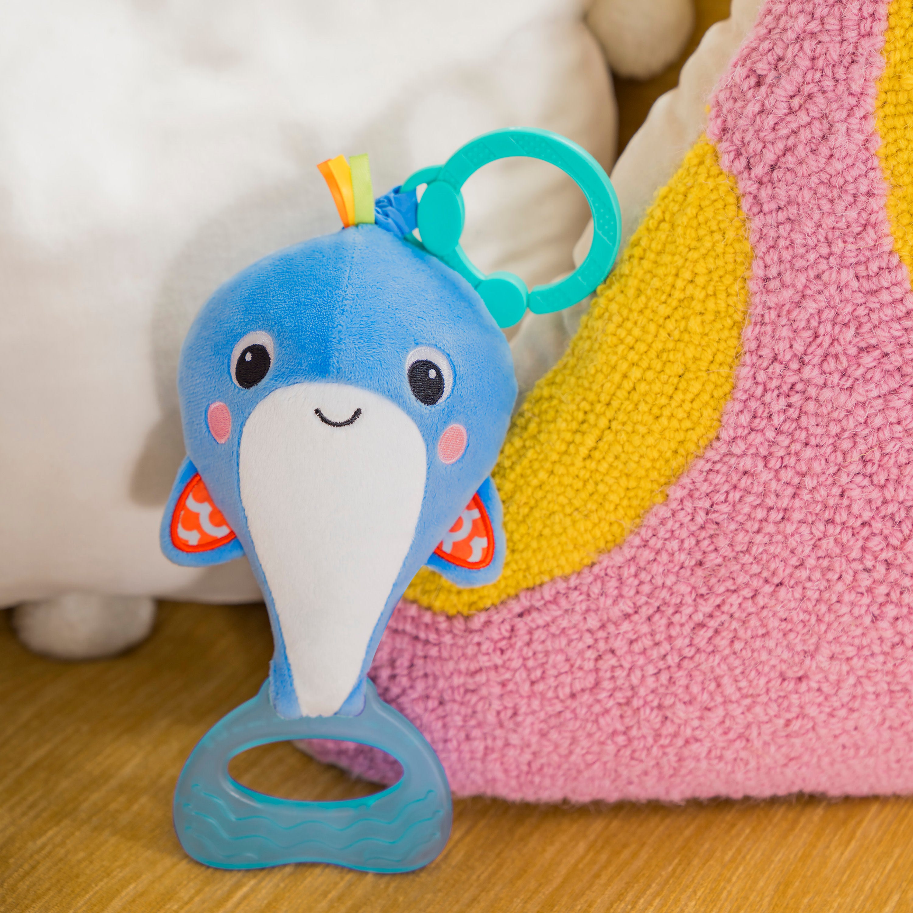 Playtime is a whale of sensory silliness with the Whale-a-roo from Bright Starts. Surprise baby with cause and effect by pulling on the whale tail for vibrations or giving it a shake for fun chiming sounds. Explore bright colored ribbons and crunchy crinkly textures. This plush take-along toy brings plenty of activity on the go.