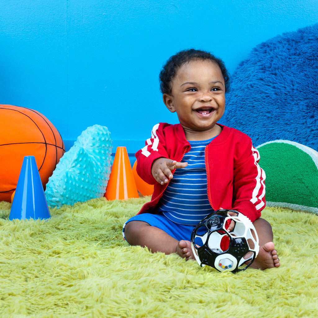 Ready, grasp, scoooore! Made with Bright Starts’ flexible, durable Oball technology, the Grippin’ Goals Rattle Ball features an easy grasp design with lots of finger holes for even the most inexperienced soccer stars to get a grip. Promote baby’s fine motor skills with this rattling ball – perfect to toss, roll, shake and kick. Rattle beads inside the black and white soccer ball introduce cause and effect for baby, encouraging their cognitive development. Easily take baby’s favorite ball on the go. It fits perfectly in a diaper bag for entertainment wherever your day leads. Baby’s first soccer ball will have them squealing with delight as they explore the fun of grasping, shaking, rolling, and so much more. Ideal for ages newborn and up. Compact size for little hands and easy storage: 5.0" (H) x 5.0" (W) x 5.0" (D). Baby shower gift idea for little boys or girls and future soccer fans!