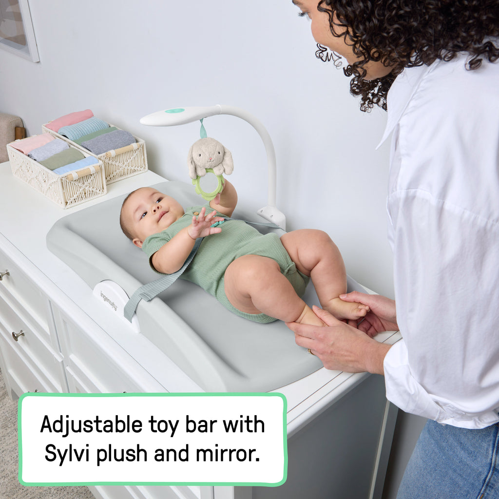 Meet Sylvi, the kind and curious friend to all! Sylvi’s sunny outlook makes everyone who knows her smile. Plus, she has plenty of superpowers your little one will love to discover, like her night light to help parents with nighttime changes. Sylvi hangs overhead to provide a friendly face for baby throughout every change. She also provides a small mirror, helping baby easily see and learn self-recognition multiple times a day. This Day & Night Changing Pad helps parents easily change baby at any hour. Our unique adjustable light bar gives adults enough light to change baby without waking baby. Simply move it around to best suit you and your little one. The light bar features red and white light options, each with 2 brightness settings, to help parents get through nighttime changes without making the whole room bright. Plus, red light has been shown to aid with melatonin production, helping little ones drift back to sleep after waking. We designed this foam surface with both parents and baby in mind. It's easy to wipe clean yet cozy enough to relax on, making changes more comfortable for baby and easier to clean for mom and dad. This changing pad was designed for safety at every step. Contoured walls and a safety strap to keep even the wiggliest baby in place. Plus, a non-slip underside ensures the pad stays in place through months of changes. Just make sure to use the pad on top of a table with minimum surface dimensions of 31 in x 17 in.