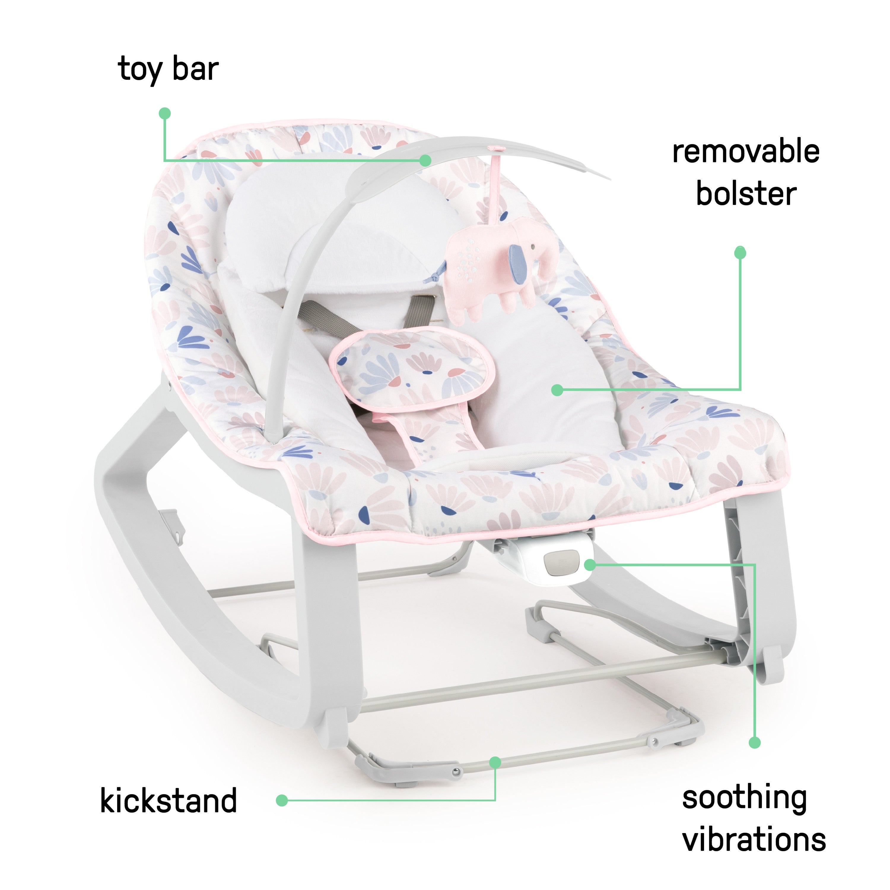 The best-selling Ingenuity Keep Cozy Baby Bouncer, Seat & Infant to Toddler Rocker grows with baby to be enjoyed for years. A new parent “must-have” with over half a million units sold, this versatile baby rocker and bouncer from the #1 manufacturer of bouncers is designed in the USA and gives you a second set of hands while baby sits comfortably in your sight. Third party tested and approved, the Keep Cozy features 3 modes in 1: bouncing, rocking, or convert it to a stationary seat for your toddler with the kickstand at the rear. Packed with features like soothing vibrations powered by 1 C battery (not included), two reclining positions for baby’s comfort and a removable infant bolster that helps newborns sit securely. Includes a detachable plush elephant hanging toy for playtime at home or on the go. Neutral design blends into any home décor. Seat pad and bolster are machine washable. Accommodates children up to 40 pounds and makes a great add to your baby registry. Assembled dimensions are 24.41" (H) x 19.49" (W) x 26.38" (D). This is the #1 bouncer, Circana, Retail Tracking Service, Bouncers, U.S. dollar sales, January-December 2024 combined.