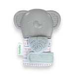 - The elephant-shaped teething mitt is crafted with silicone, safe for your tiny tot's mouth. The mitt massages sore gums and provides relief to emerging teeth