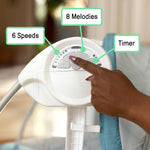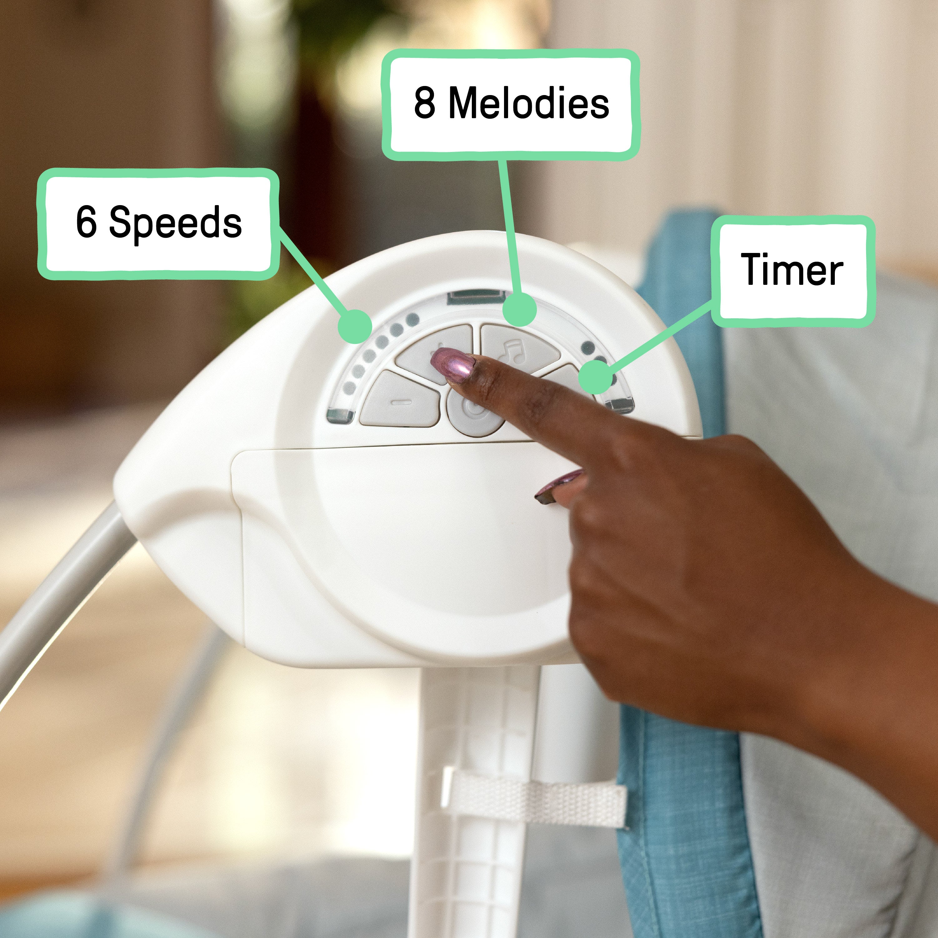 - This baby swing is equipped with a large, full canopy to provide your little one with comfort. The swing has 6 speed options and cutting-edge TrueSpeed weight-sensing technology with a timer