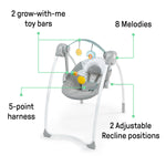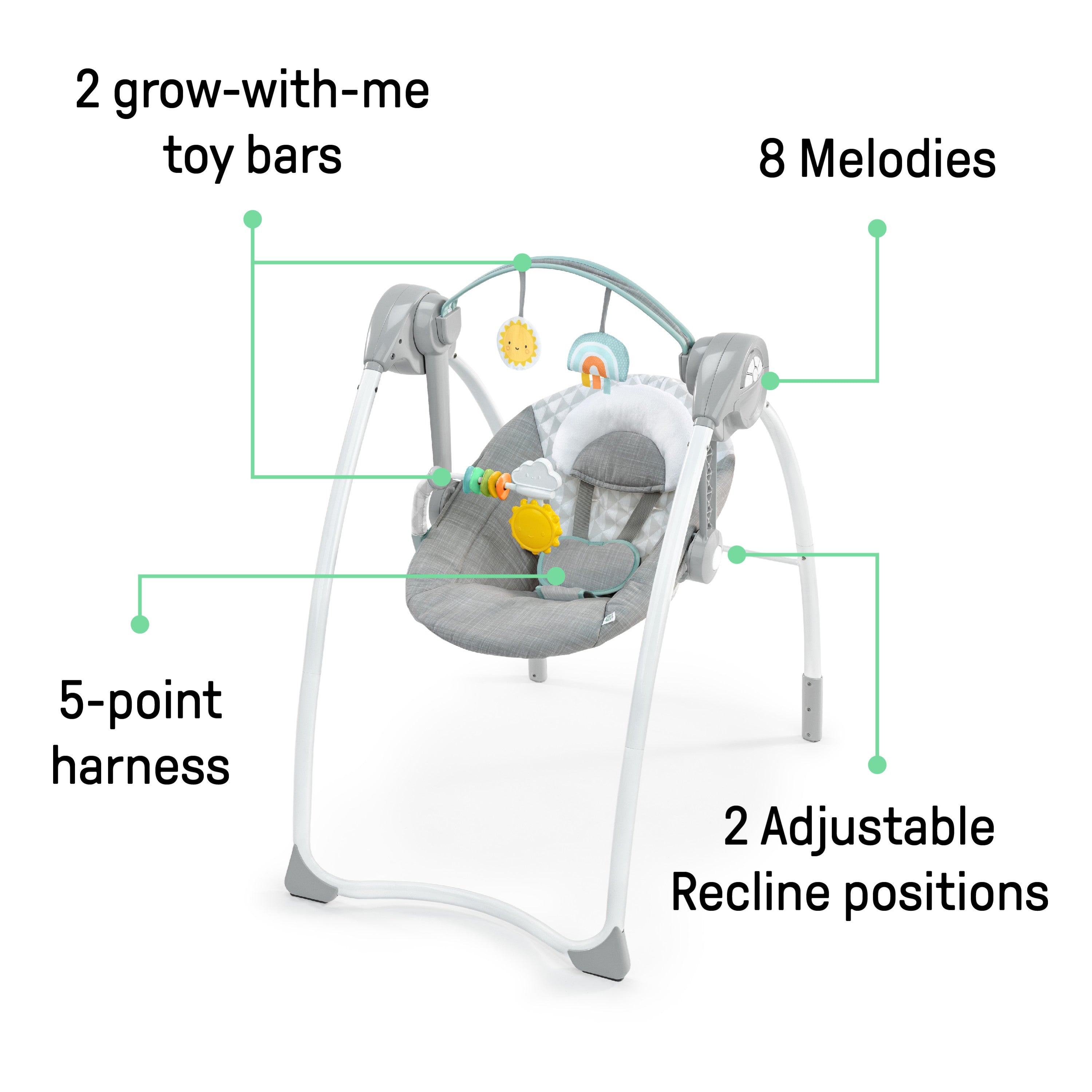 - The compact design of this full-size swing is foldable for easy portability and storage. This swing is part of Ingenuity's Sun Valley Collection, which taps into colorful minimalism; double toy bar includes bright, engaging toys for baby