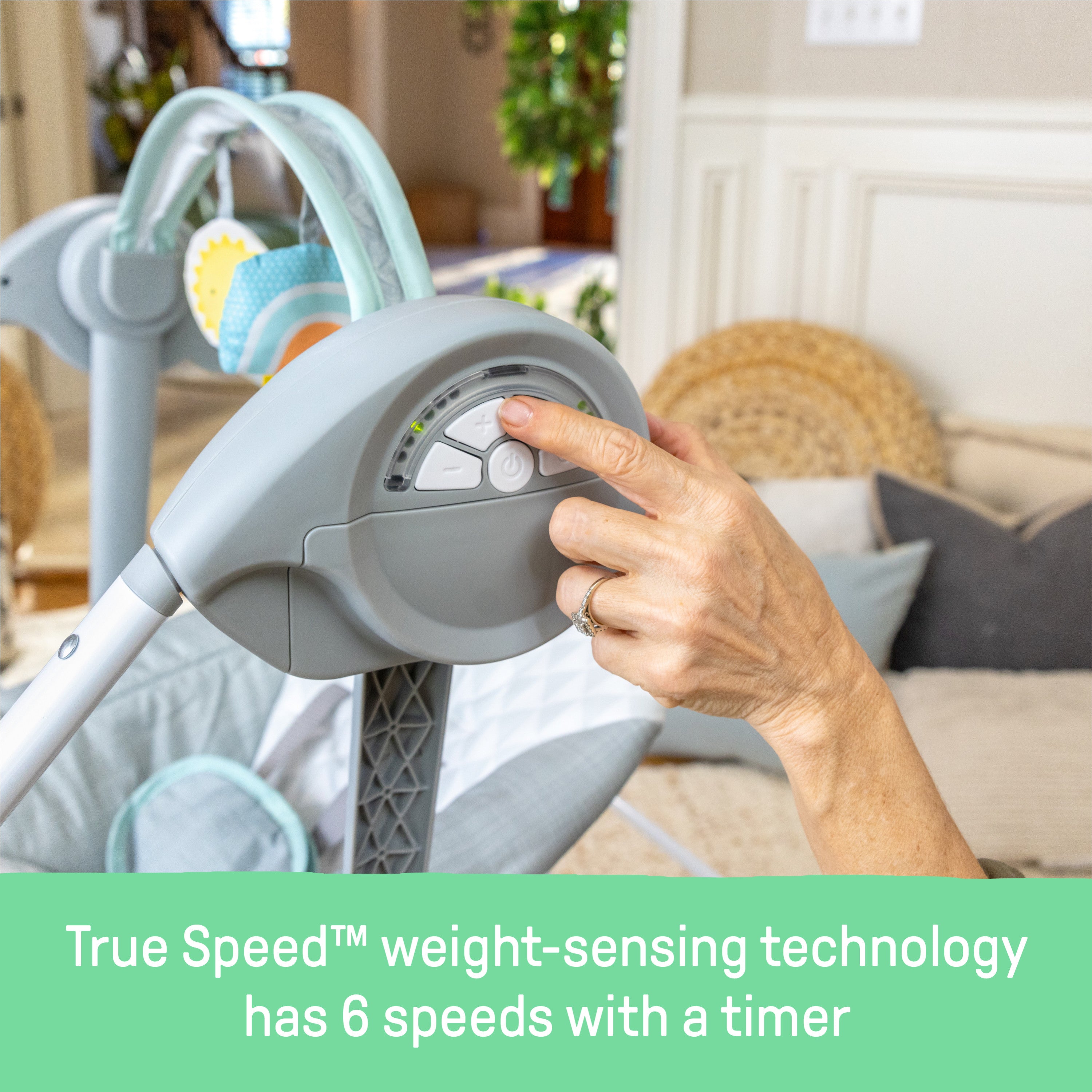 - The swing seat can be adjusted as baby grows with 2 recline positions for comfort. This baby swing offers 6 speeds with TrueSpeed weight-sensing technology with a timer