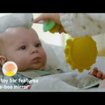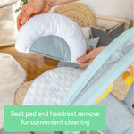 Toy bar, toys, headrest, and seat pad easily wipe clean with a damp cloth.