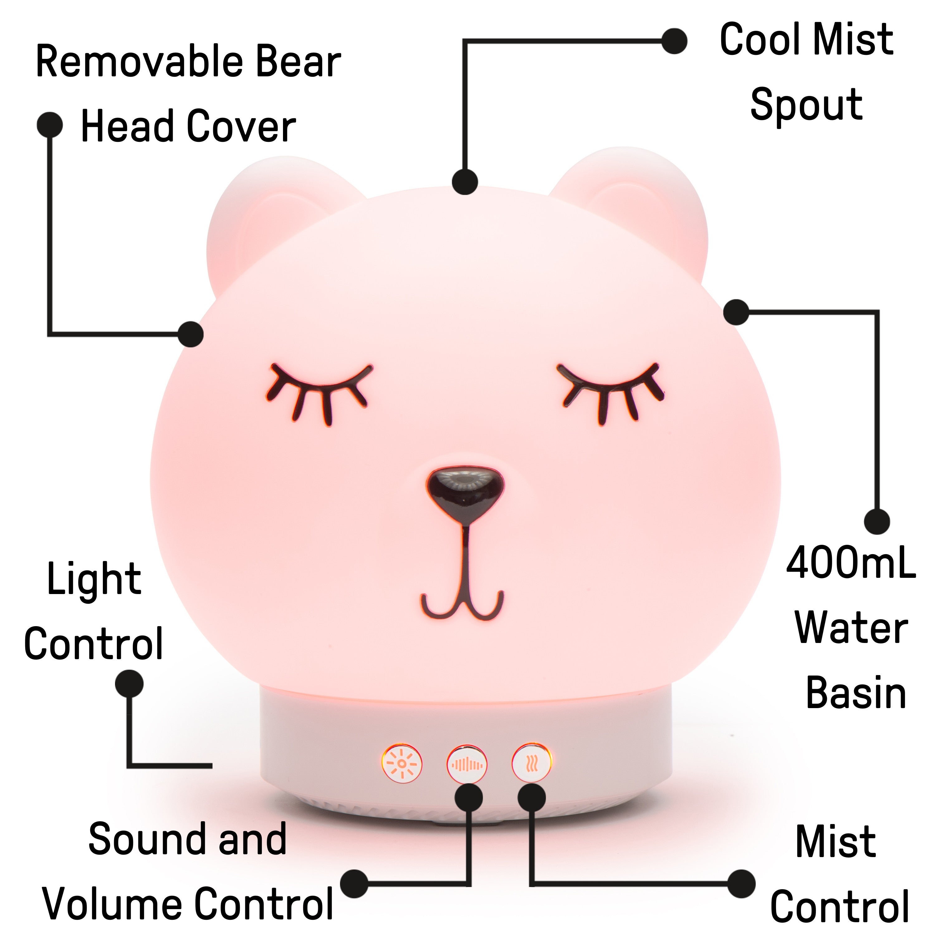 - Use the night light to create a soothing glow, a red light to boost melatonin, pink noise to promote deep sleep, a cool-mist humidifier that helps keep the room at optimal humidity, and essential oil diffuser for a relaxing bedtime experience