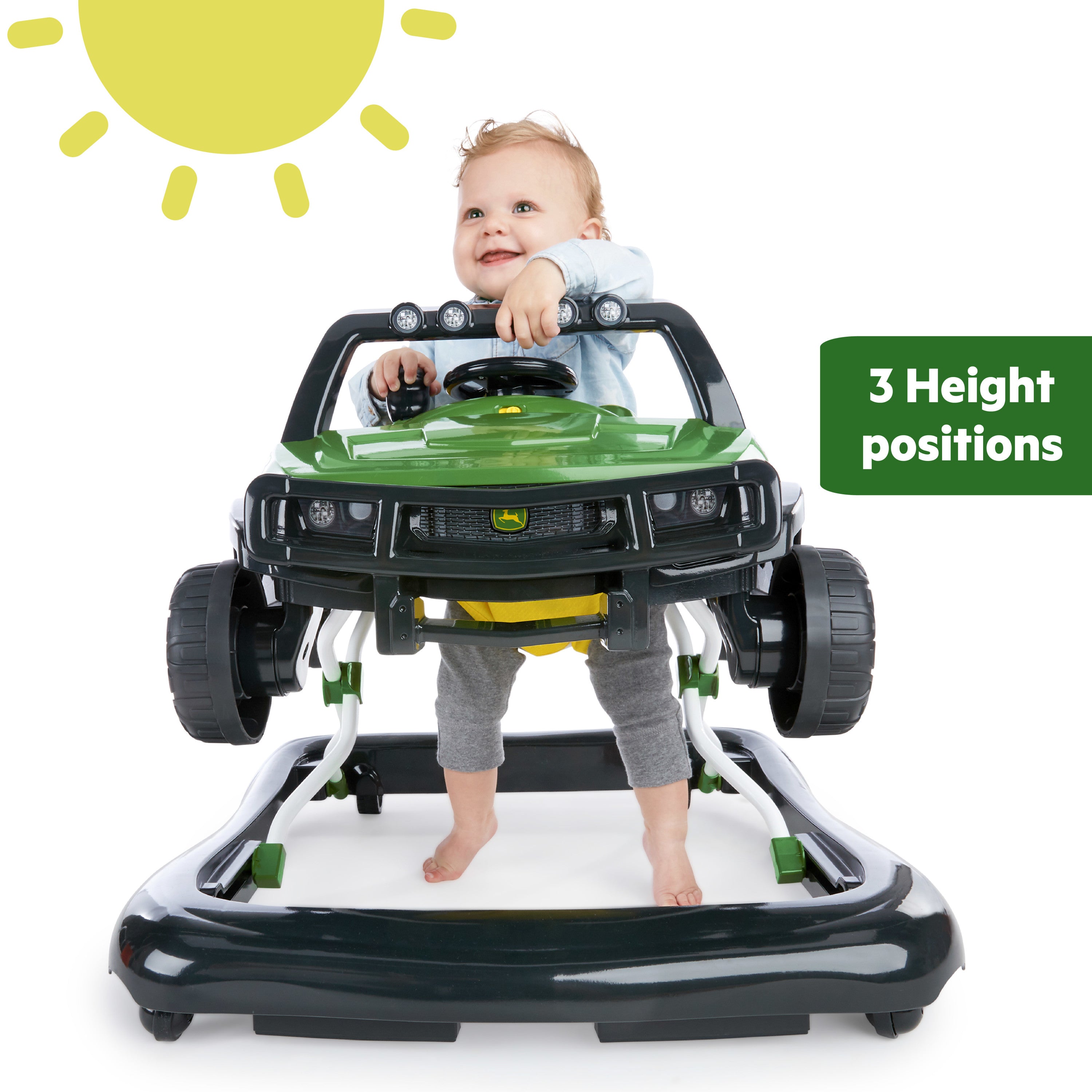 Who doesn’t love a Gator ride? Now baby can rip and roar in his very own utility vehicle… fueled by little feet and baby-power! This amazing 4 in 1 baby walker for baby supports both pre-walkers and more experienced walkers. Two can play at once! One baby can play in normal walker mode to encourage gross motor skills and more advanced walkers can use the push-behind mode to plow ahead. To use in push-behind mode, simply lift the push bar and remove the vehicle from the walker base. A high seat back provides comfort and support for baby. For even more fun, remove the steering wheel play station for seated play or on-the-go fun. In any of its 4 modes, baby will steer right into imaginative play with the authentic John Deere Gator sounds, lights, gear shifter, steering wheel and the look of this rugged utility walker. It is safety enhanced with rubber feet that "brake" and a sturdy frame. When playtime is over, the walker is easy to wipe clean and it folds up for storage. Make the fun last even longer by adjusting the walker frame to three different height positions to keep little toes at the perfect height. With this John Deere walker, you and baby are going to have a field day! This walker is thoughtfully designed to meet all required safety standards. Please follow all product warnings including never leaving your child unattended, keeping children away from hot surfaces and hazards, and blocking stairs before use.