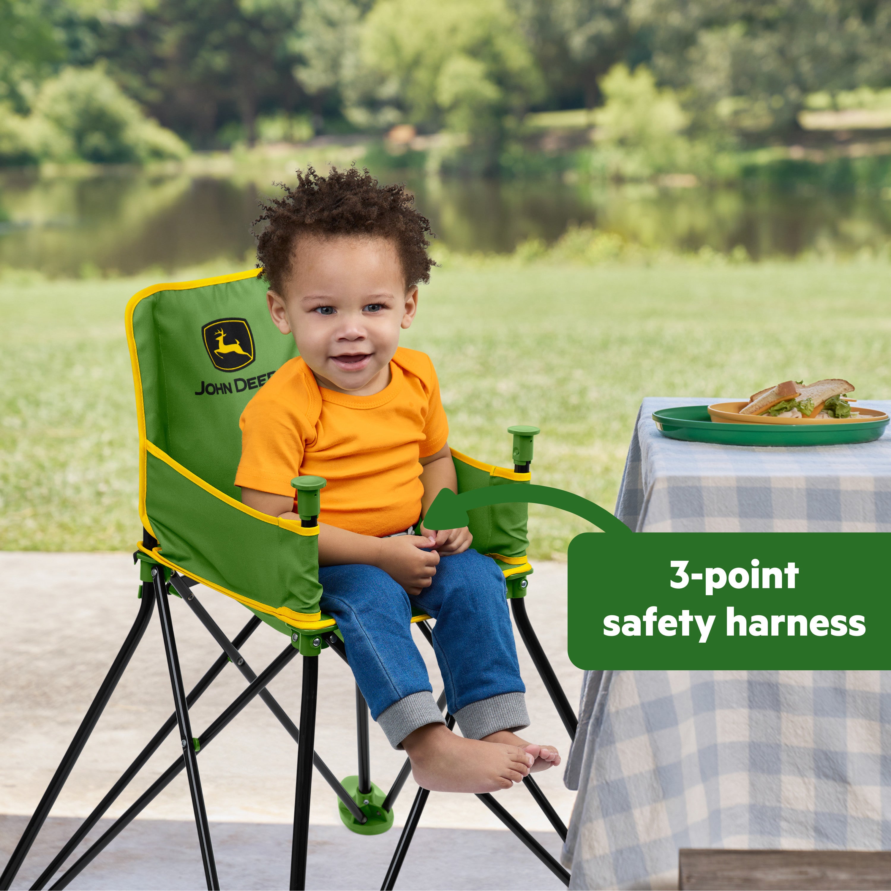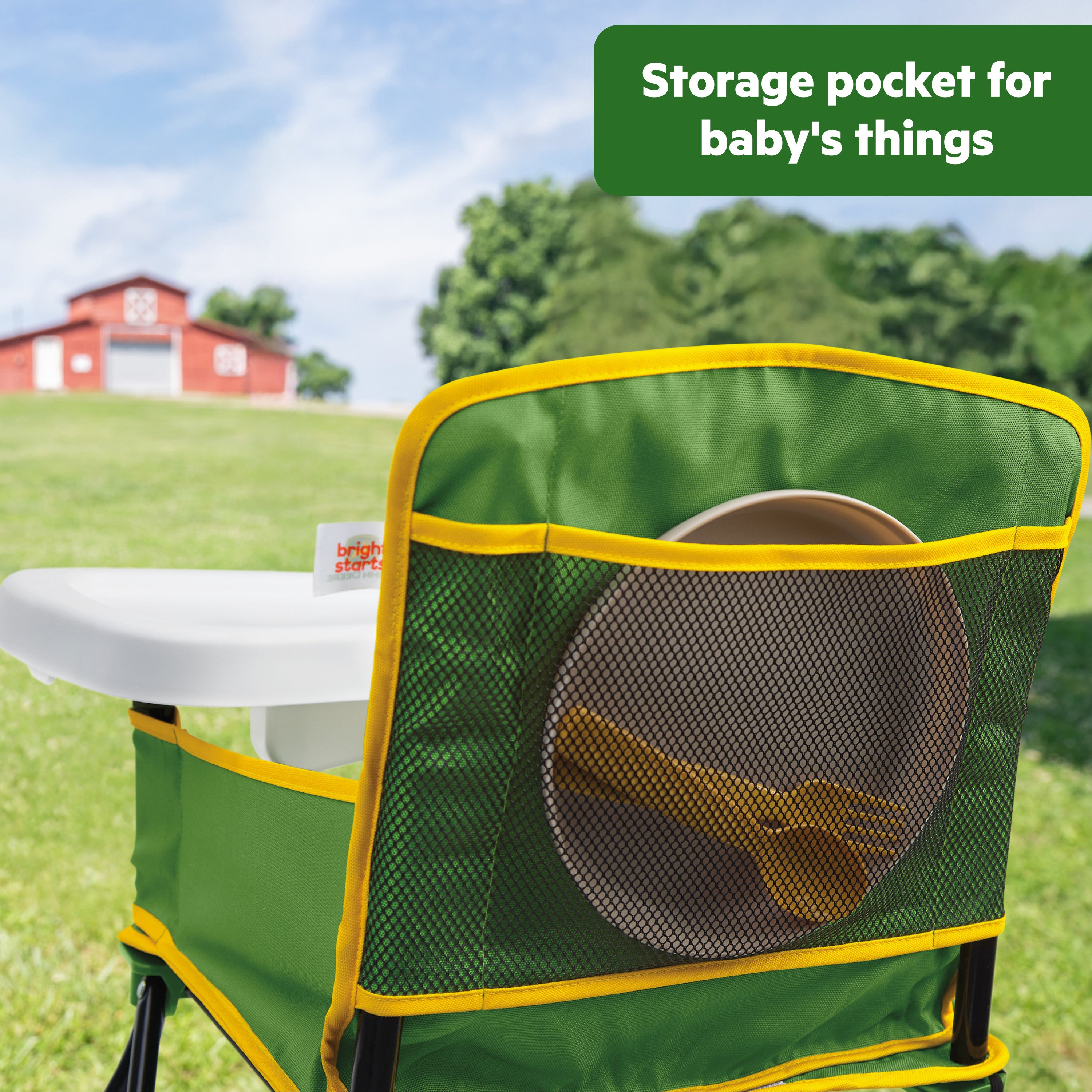 - Bright Starts John Deere Pop ‘N Dine lets you take mealtime on the go; this travel high chair is perfect for restaurants, backyards, or family adventures
