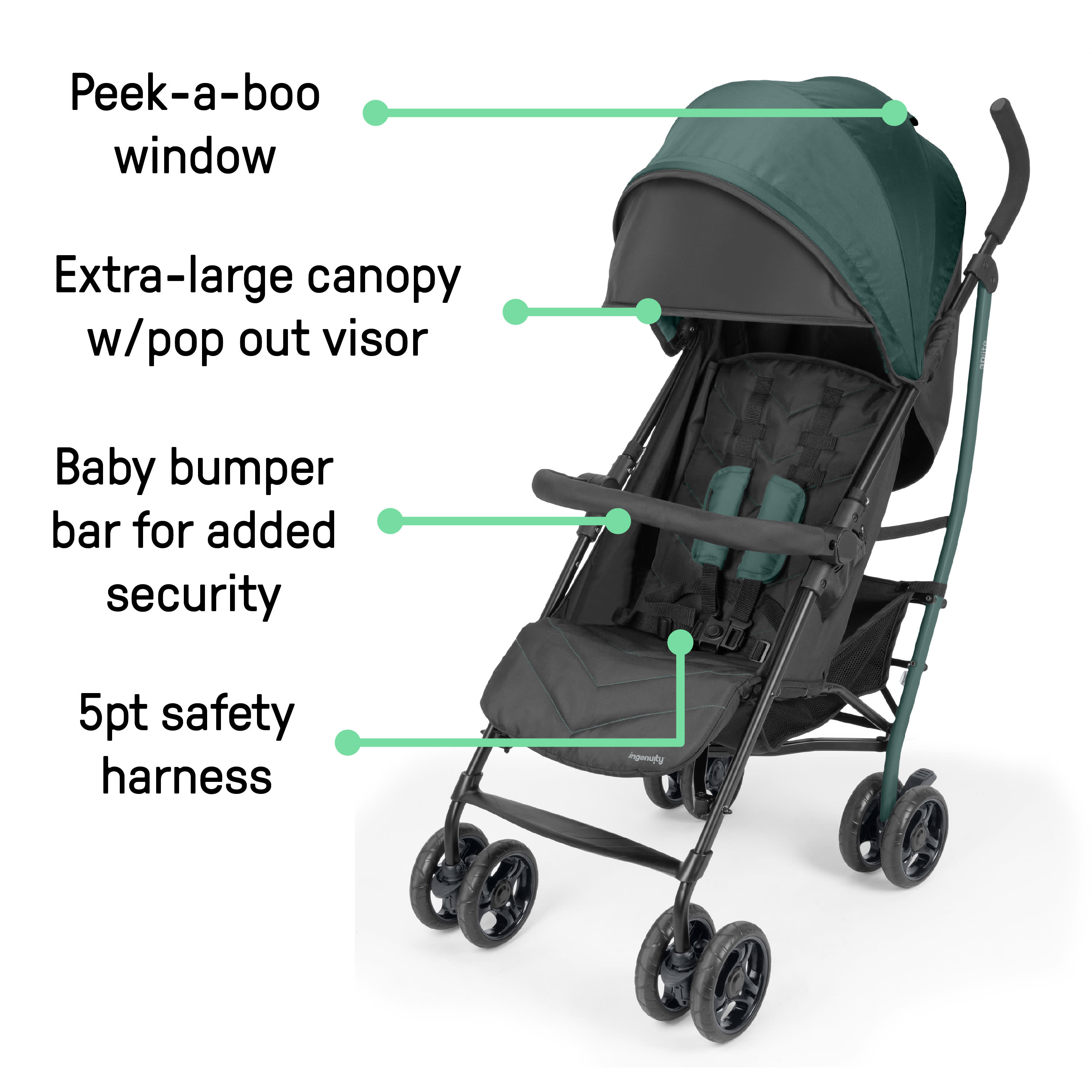 The Ingenuity 3Dlite Jewel Convenience Stroller combines elevated style with everyday function, giving parents confidence on every outing. At just 14 lbs, this lightweight stroller is one of the only umbrella-style stroller designed to be compatible with select infant car seats*—making it a go-to choice for families who need flexibility from day one. A bumper bar adds security (and folds with the stroller, so you never need to remove it), while the multi-position recline seat helps keep baby comfortable as they grow. Parents will appreciate thoughtful details like an oversized canopy with flip-out visor, peek-a-boo window, parent cup holder, and storage pocket. An extra-large underseat basket provides room for all your essentials, while premium fabrics and stitching elevate the look. With a durable steel frame, 5-point harness, and compact fold with auto-lock, the 3Dlite Jewel proves you don’t have to sacrifice style for function. From coffee runs to travel adventures, this stroller is built to fit your real life. *Compatible with a variety of carseats, including the Graco SnugRide® SnugFitTM, Graco SnugRide® SnugLock®, Graco SnugRide® Lite, Evenflo Litemax, Chicco Keyfit, Safety 1ˢᵗ® on Board™. Carseat not included. Assembled dimensions: 40.16" (H) x 18.9" (W) x 25.59" (L).