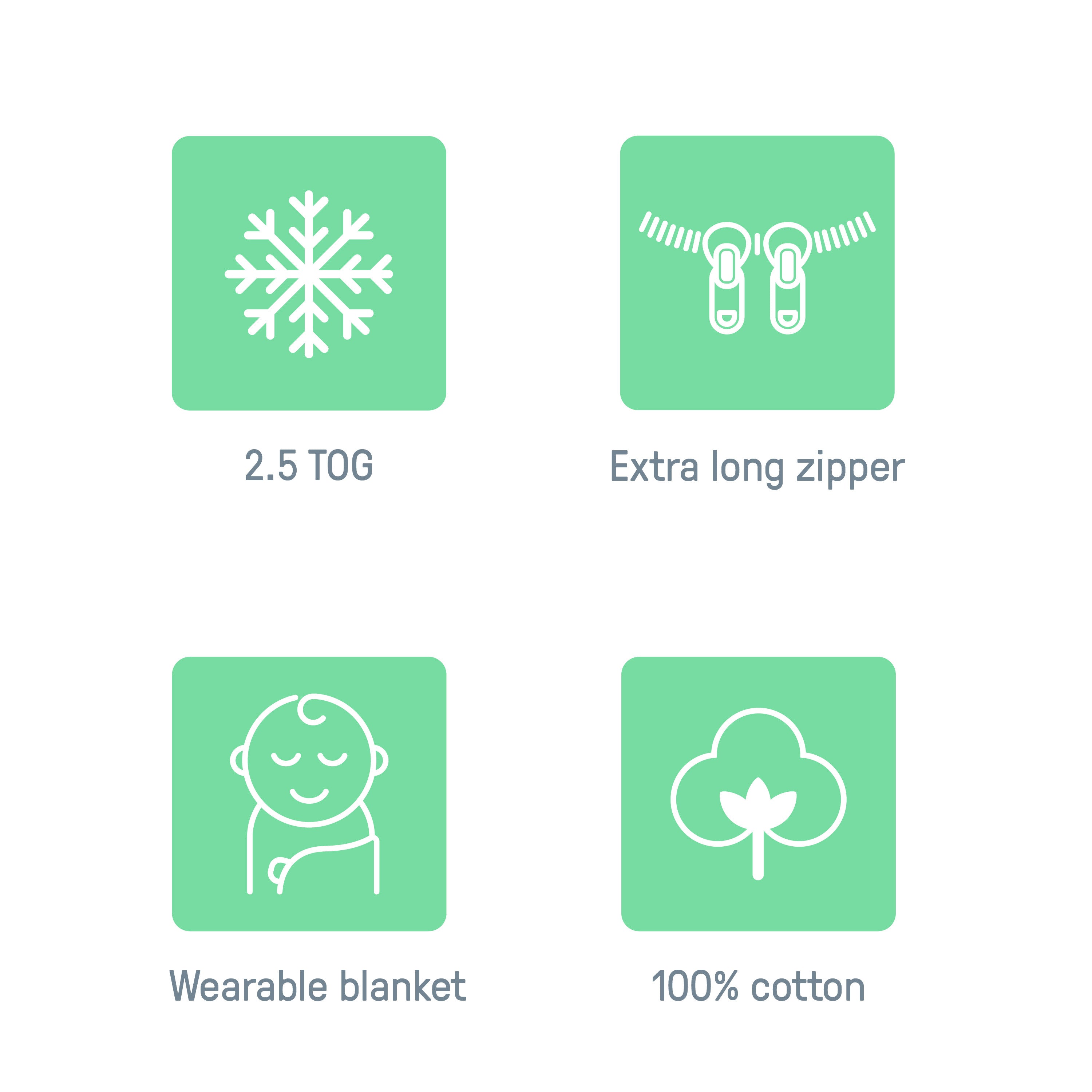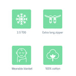 - Designed to be layered with pajamas, this wearable blanket is perfect for growing babies! It is a 2.5 TOG, rated for cooler climates with lots of length to grow along side baby for longer wear