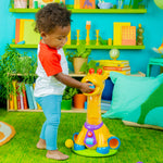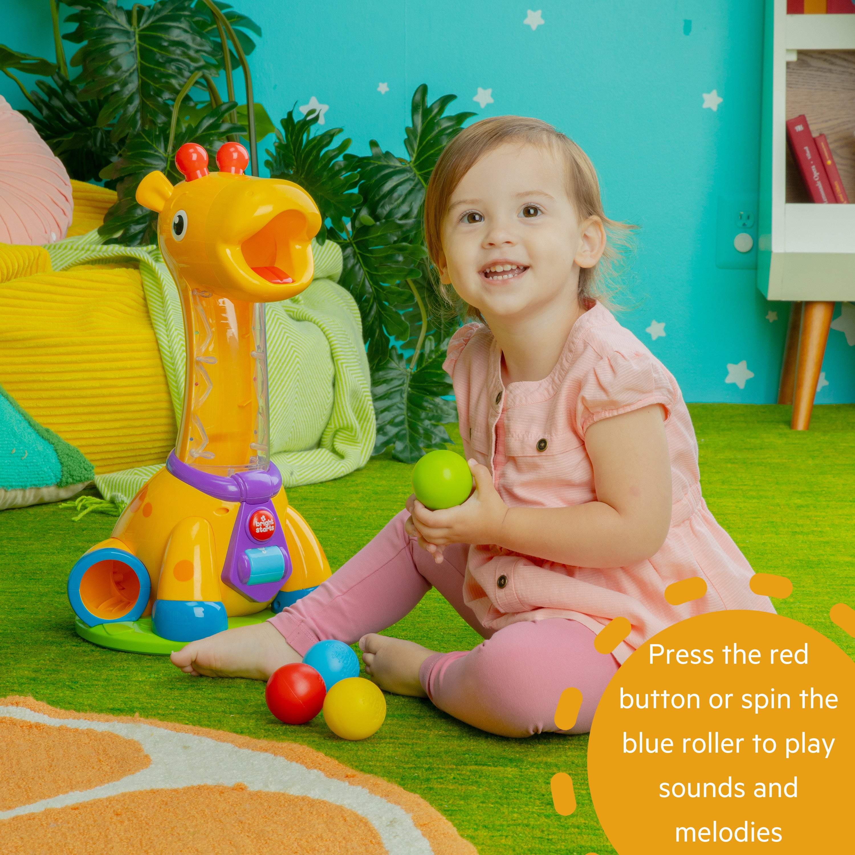Fun Comes First! Bright Starts just put a whole new spin on giggling fun with the Having a Ball Spin & Giggle Giraffe! This irresistible giraffe will keep your baby engaged and on the move. Sitting babies can drop balls into the giraffe’s mouth for music & lights. When your infant pushes the button or bats at the roller on giraffe’s tie, the silly sounds and melodies get the giggles going. Toddlers can press giraffe’s horns to make him spin around. Balls placed in the giraffe's mouth will roll out at the feet, encouraging baby’s gross motor skills and engage in cause and effect play. 5 colorful balls are included. Take the time to be silly, live in the moment and enjoy the best sound in the entire world - your baby's laughter. Recommended for ages 12 months and up.