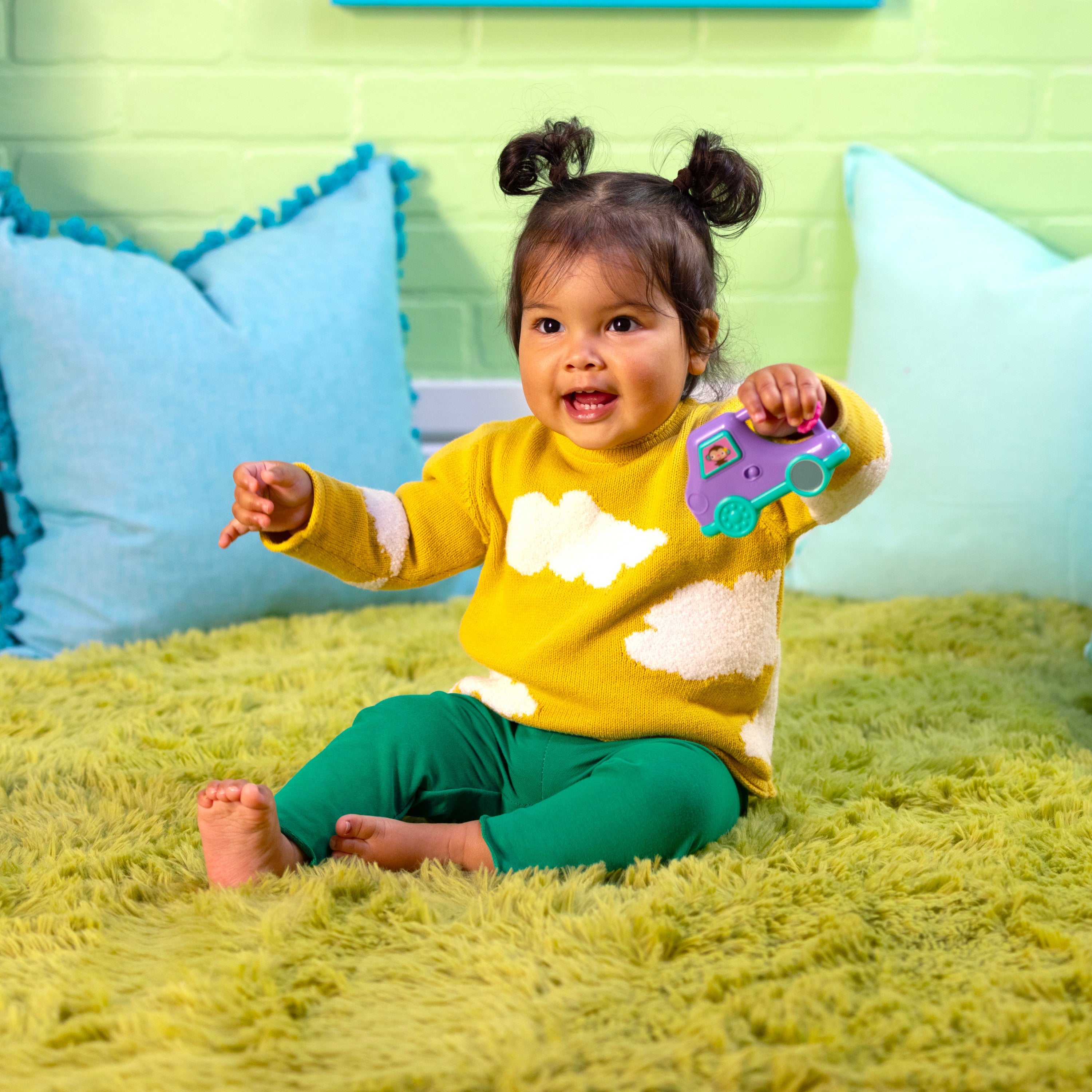 The Safari Driver Take Along Toy from Bright Starts brings a jungle of joy to playtime as baby cruises along with a fun monkey character. Music, lights, and car sounds are activated by the simple push of a button, introducing cause & effect and helping baby practice fine motor skills. Designed for ages 3 months and up, this entertaining purple and teal truck toy includes a pink bead chaser for open-ended play. Introduce self-discovery with the baby-safe ‘tire’ mirror! An easy-grasp handle makes it easy for baby to monkey around with their primate pal, bringing truckloads of playtime wherever they go. Explore the textured tires and beads for more sensory fun. This unisex toy is great to keep in your diaper bag for entertainment on the go and makes a great gift idea. It’s easy to clean, too! Simply wipe clean with damp cloth and mild dish soap. Compact design for travel and on the go entertainment. Dimensions: 2.87" (H) x 1.1" (W) x 4.33" (L).