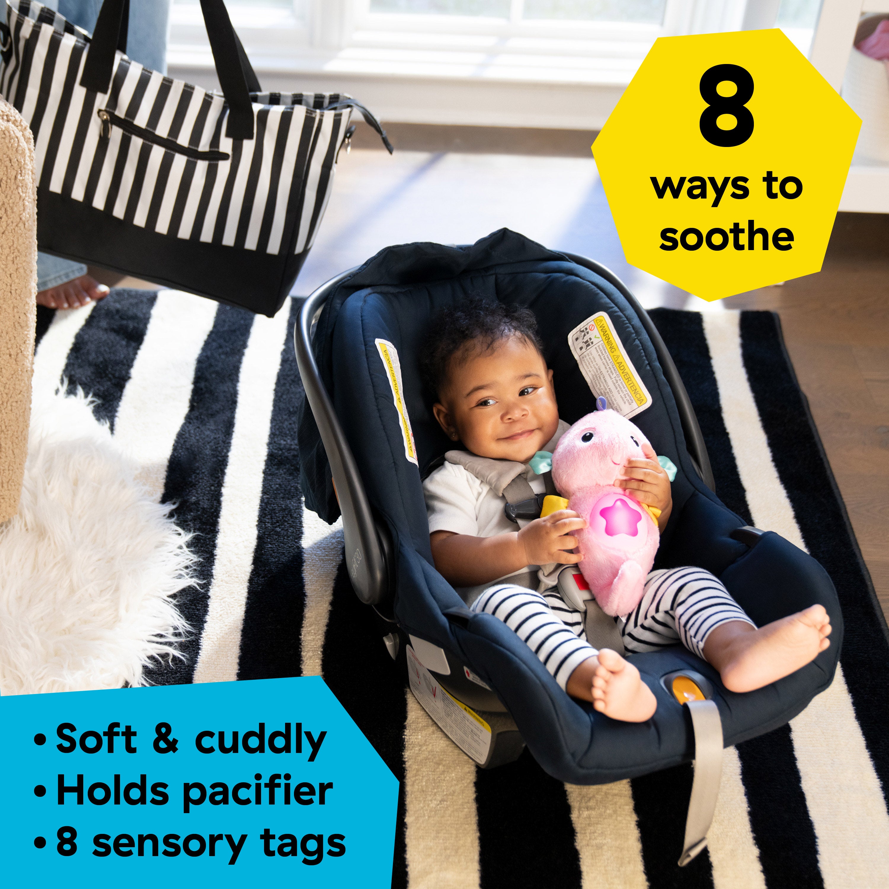 - Soft, plush toy holds your child’s favorite pacifier close by, to give them a way to self-soothe anytime they hold her; 8 colorful Taggies engage baby’s fingers and eyes; for ages 0+ months