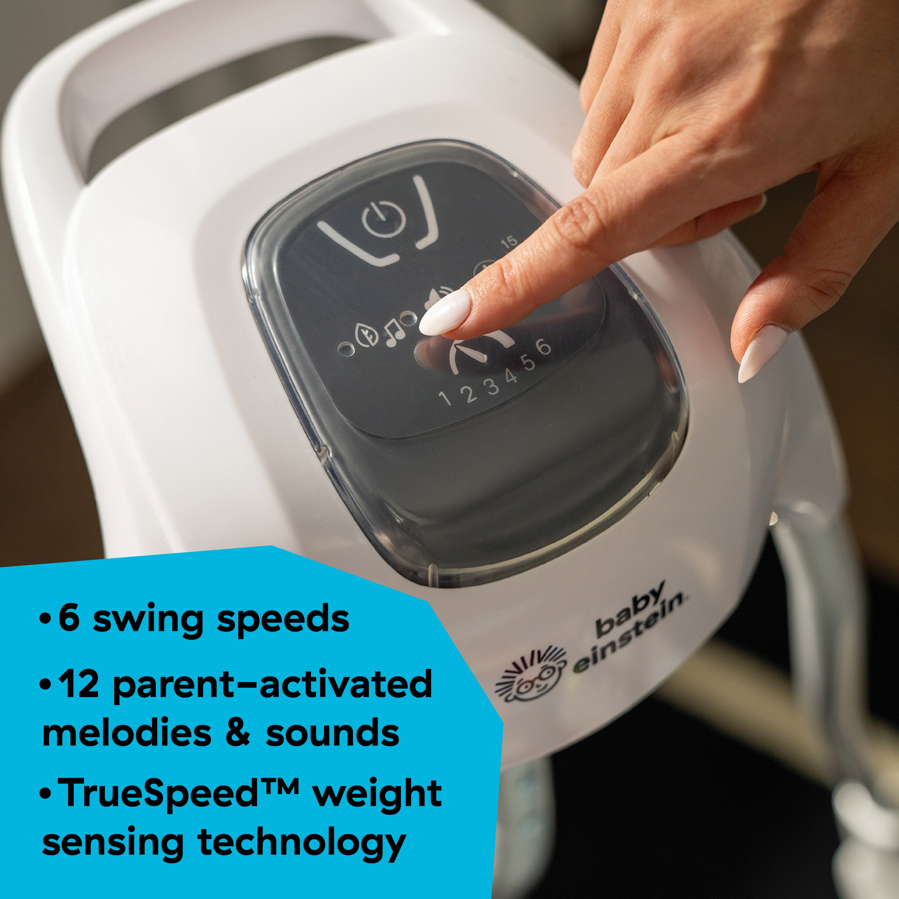 - Swing features 12 melodies and sounds; 6 speeds automatically adjust to baby’s weight; transform the swing into an infant rocker in 1 easy step or detach seat pad for tummy time play