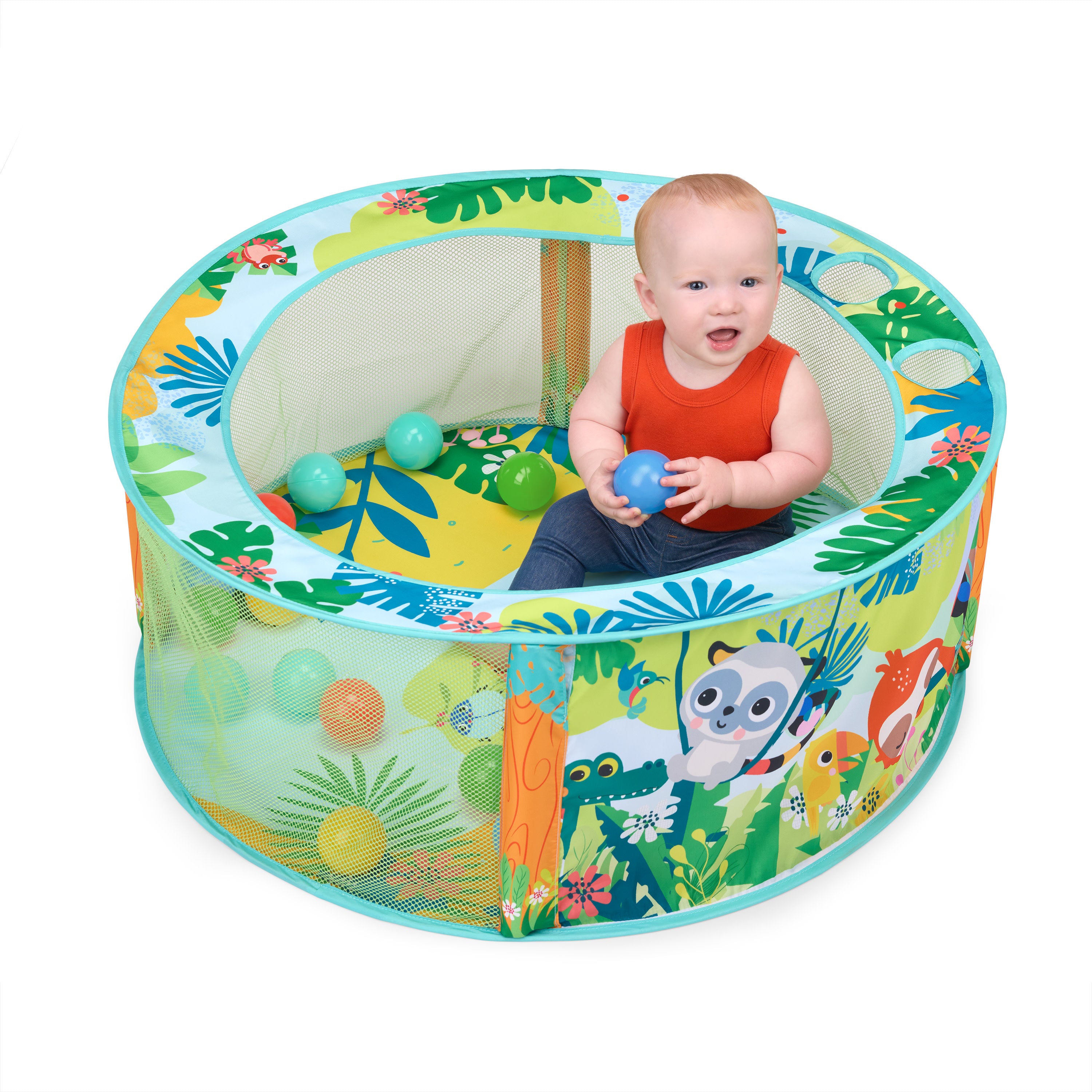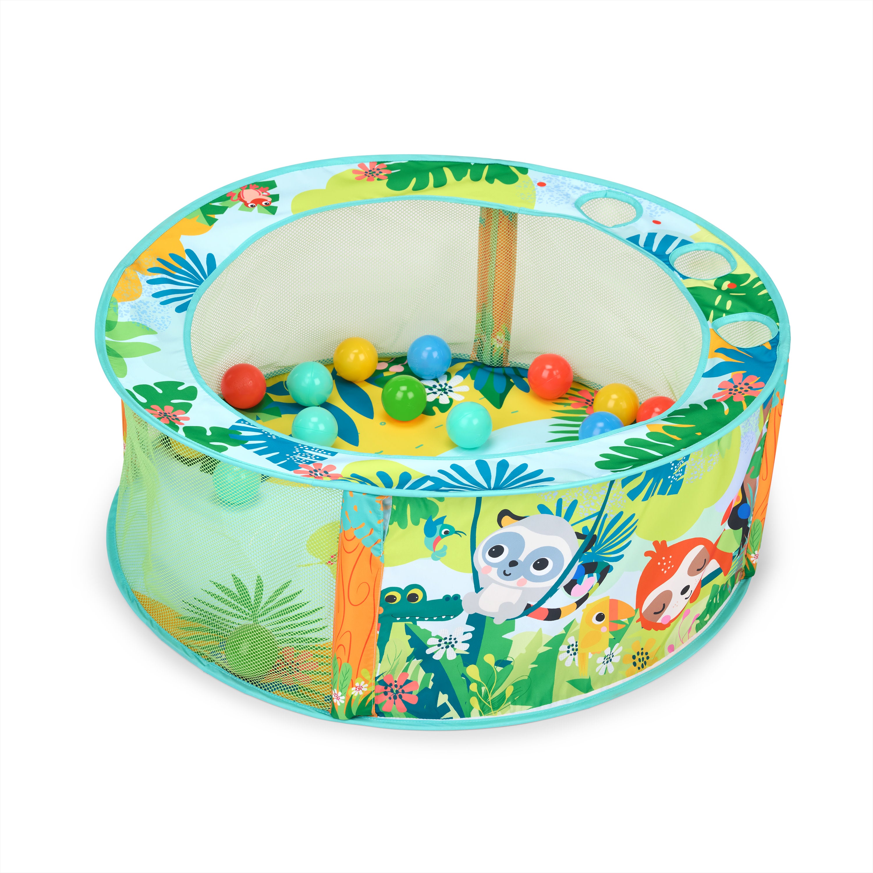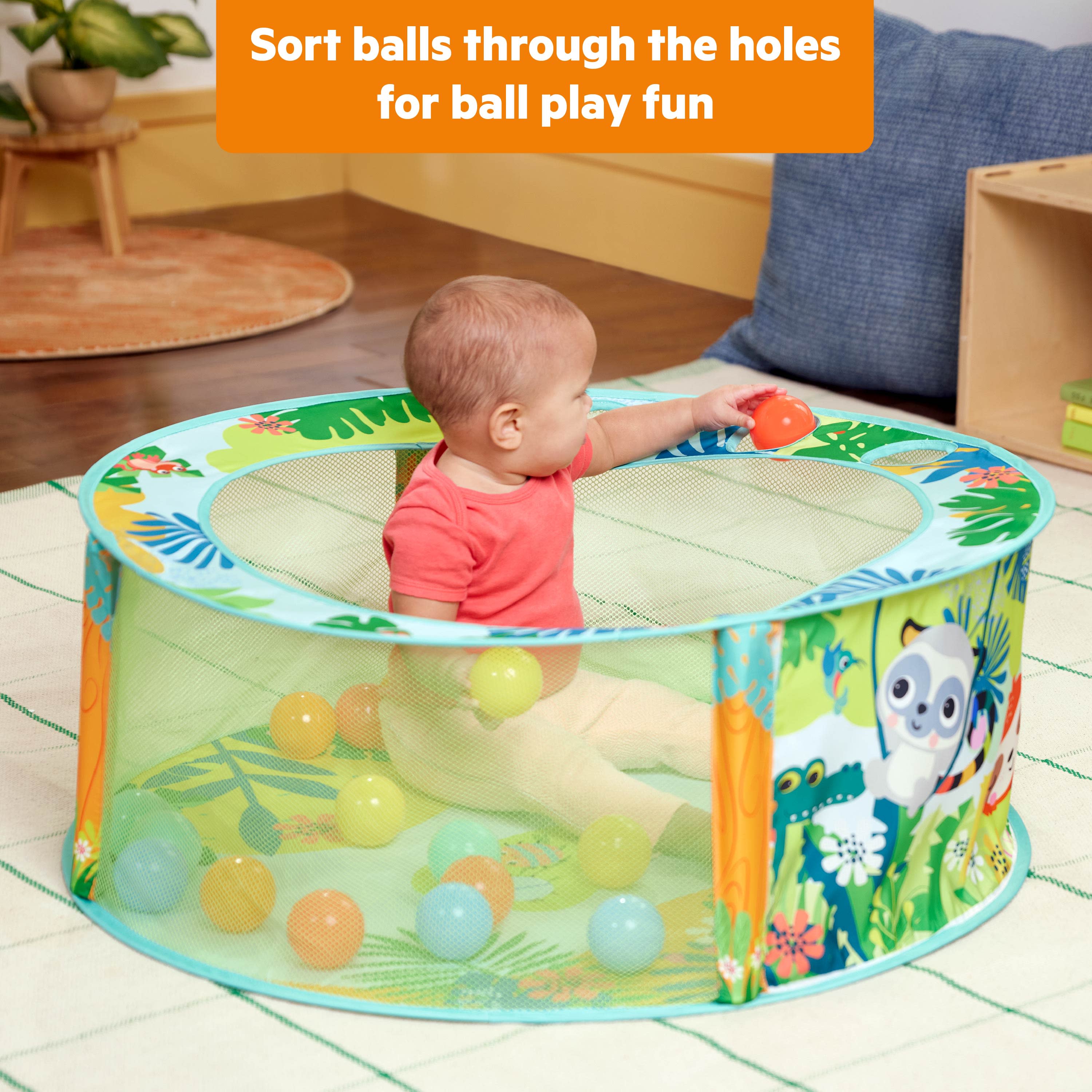 Get ready to have a ball with the Bright Starts Rowdy Rainforest Stow & Go Ball Pit! This foldable baby ball pit comes with 20 balls and a carry bag for sit and play fun wherever the day takes you. Thoughtfully-designed, it immerses your little explorer in a playful rainforest scene featuring Bright Starts animal characters. The ball pit ridge includes 3 ball-drop openings, so baby can practice their fine motor skills. Simply twist and fold down when playtime is over! The exciting baby play gym encourages motor skill development as baby enjoys grasping, tossing, rolling, and catching the colorful balls. Peek-a-boo! The panels are made with a mesh material, so you can keep a close eye on the action. Ideal for small spaces and travel with convenient, compact storage. Makes a great gift for baby showers, birthdays, and holidays like Christmas and Hanukkah. Designed for ages 6 months and up. Opens up to a spacious 31.5” diameter for play.